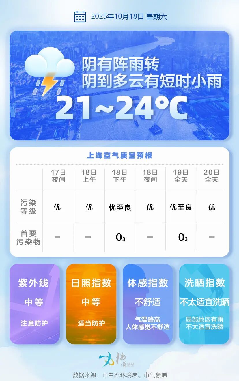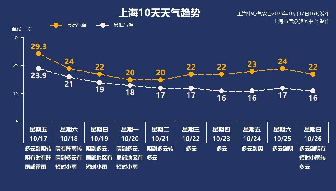 昨天白天阳光在线,气温攀升明显,午后市区徐家汇站最高气温29.3℃,郊区中闵行站30.6℃为全市最高。随着雨带南压,昨天半夜起上海雨势加强,转为阴有时有阵雨或雷雨的天气,较明显降水。