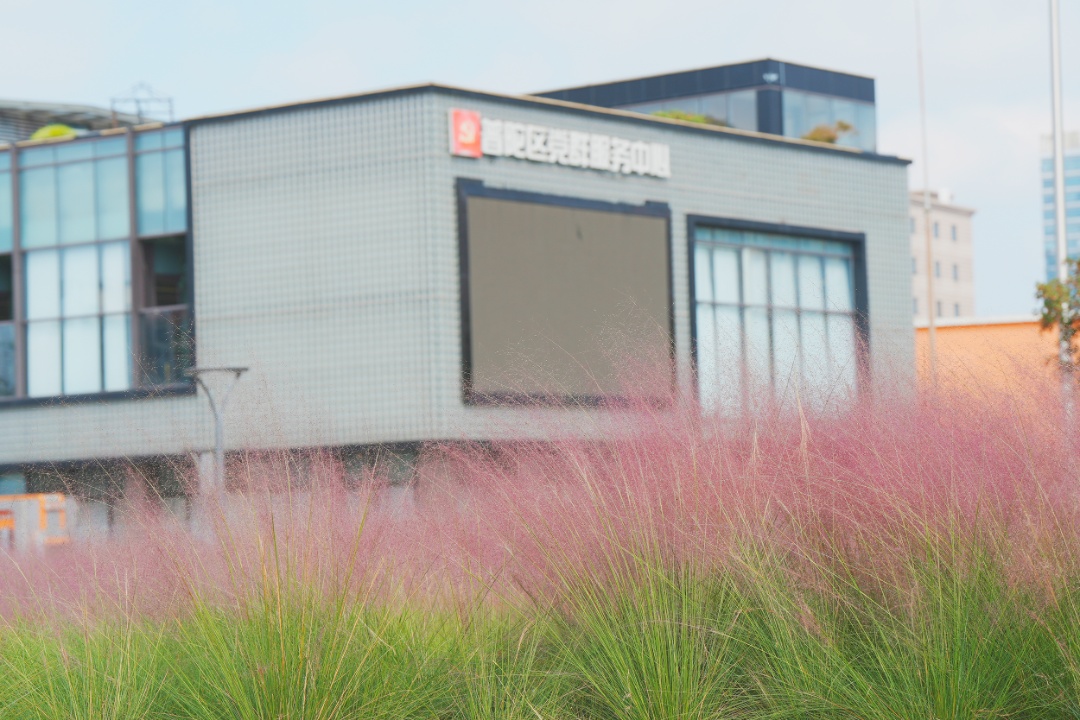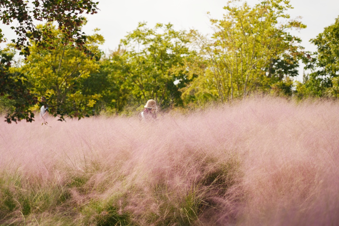 说起这秋天最特别的颜色,当属公园北侧(近同普路)的粉黛乱子草花田。这片占地面积约200平方米的花田,云雾状的花絮在秋风中摇曳,形成海浪般的粉色景观。