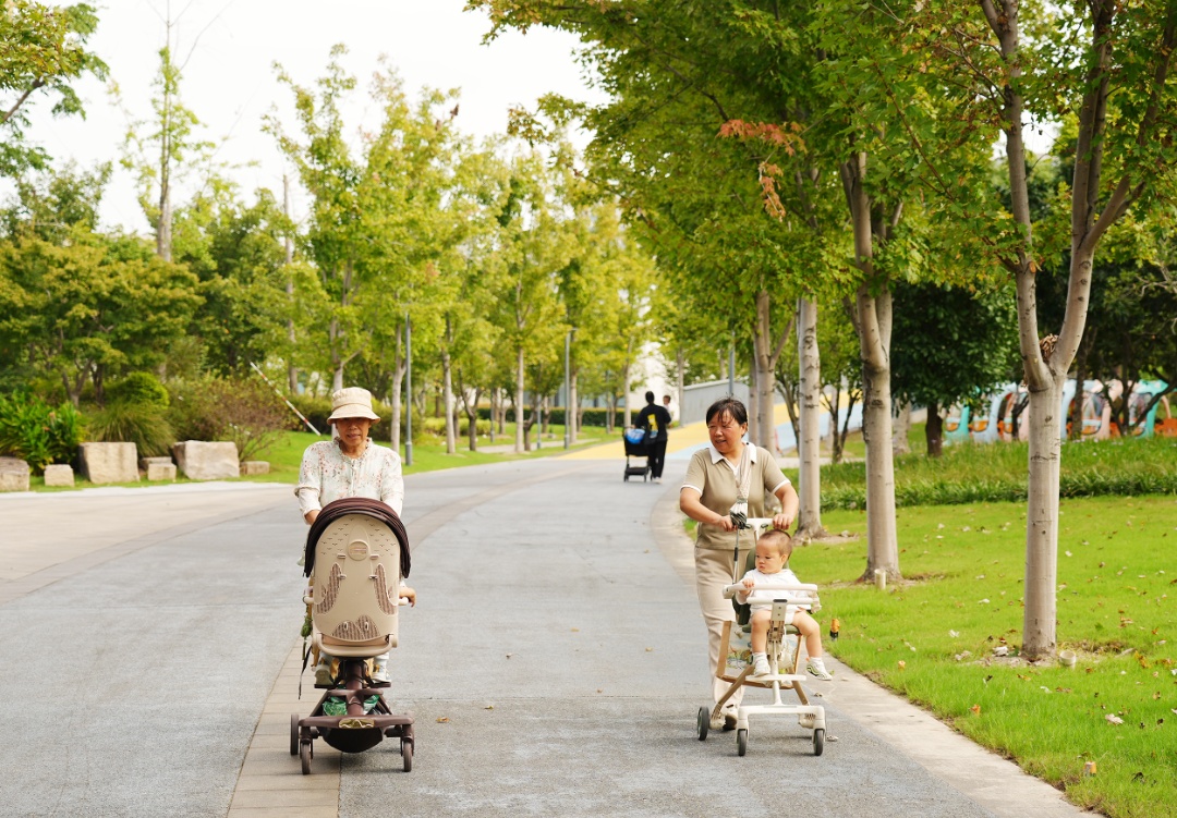 一旁的枫叶大道上,几株枫叶已迫不及待,率先将绿色的“外衣”渐变为火红的装扮。秋天最具代表性的栾树,如今已果实满树,一颗颗果实挂在空中,红的、橙的……与绿色相互勾勒出色彩明艳的渐变线条。不少市民抓住这短暂的秋日时光,举家前来公园赏秋。
