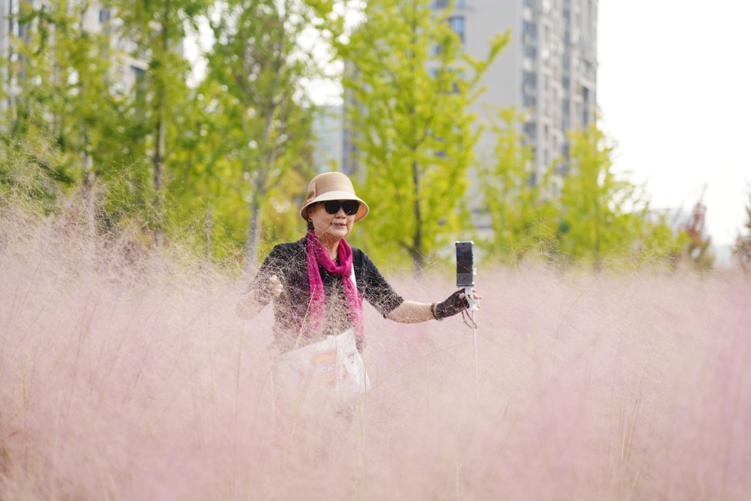 远观,粉黛乱子草宛如棉花糖铺陈在绿毯之上;近看,纤细的花穗在阳光下透出粉紫光泽,就连蜻蜓也被吸引,久久不愿离开这片粉色的海洋。如今,这里已成为一片网红打卡地,吸引着众多市民游客纷至沓来。