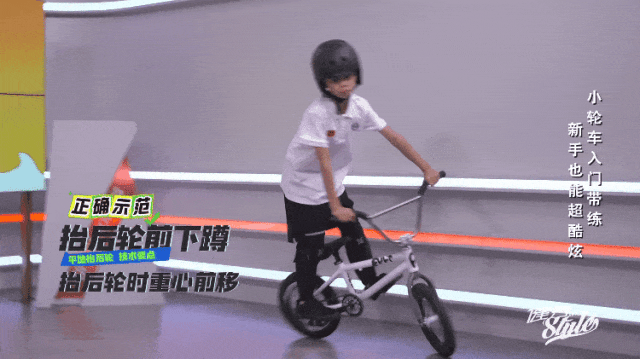跟抬前轮有一点像,也一定要保持先下蹲的状态,但是在脚用力的时候,重心稍微向前移动一点点。