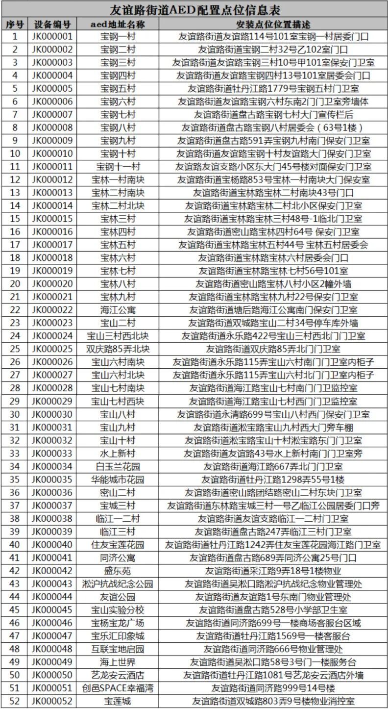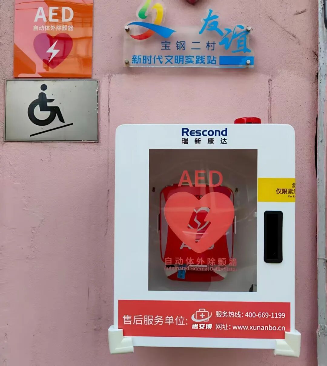 为响应2025年上海市政府为民办实事项目部署,进一步完善公共急救基础设施网络,友谊路街道经过多轮调研论证、点位优化,精准聚焦人流密集区域与居民日常活动场景,高效推进AED配置工作。截至目前,52台AED已全部在指定点位安装调试完毕,正式“上岗待命”,从宝钢一村、宝林二村等居民小区的居委会门口、门卫室,到上海淞沪抗战纪念公园、友谊公园的物业管理处,再到宝杨宝龙广场、宝乐汇印象城的客服台区域,“救命神器”的身影随处可见,为居民日常出行、休闲活动增添了一份安全底气。