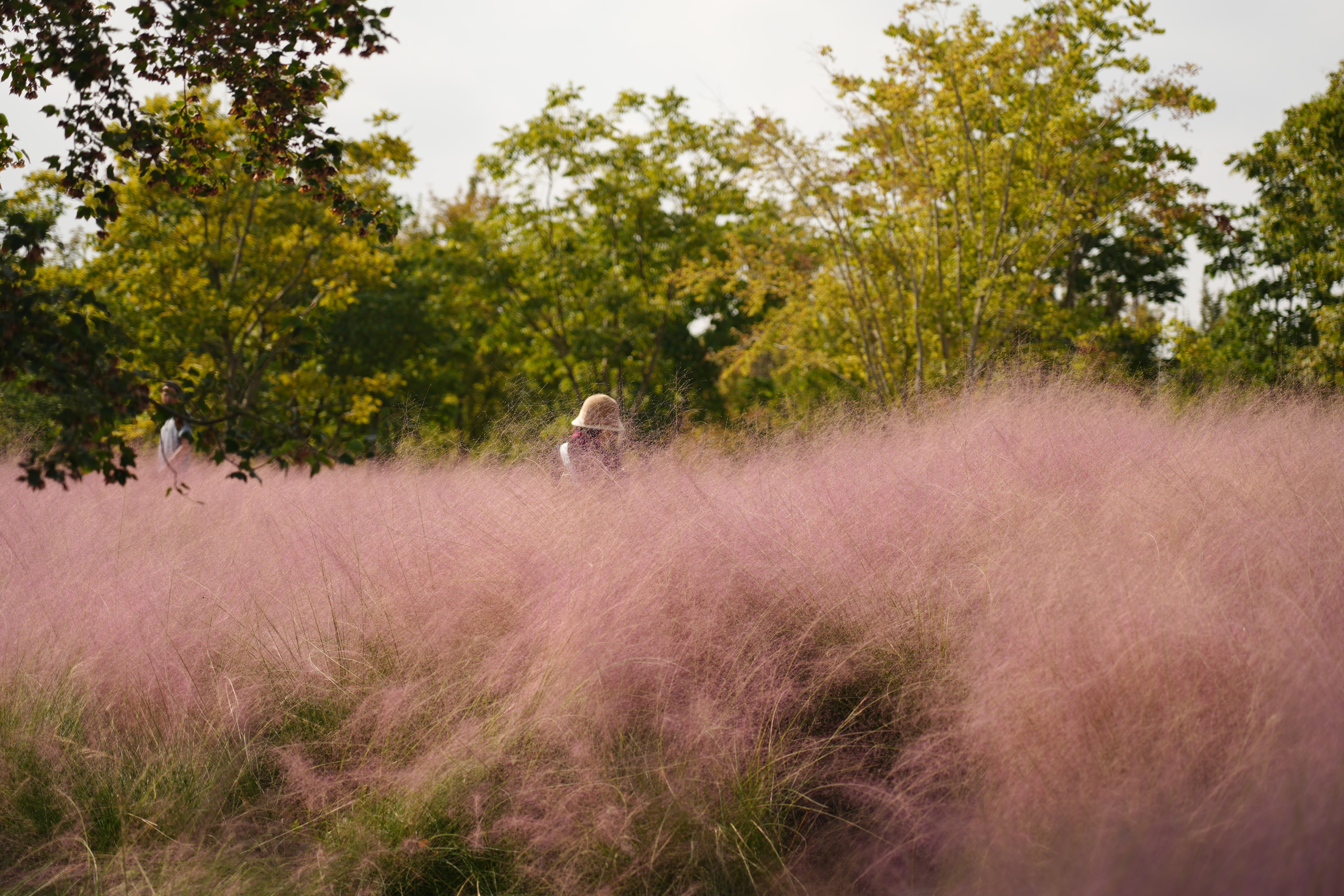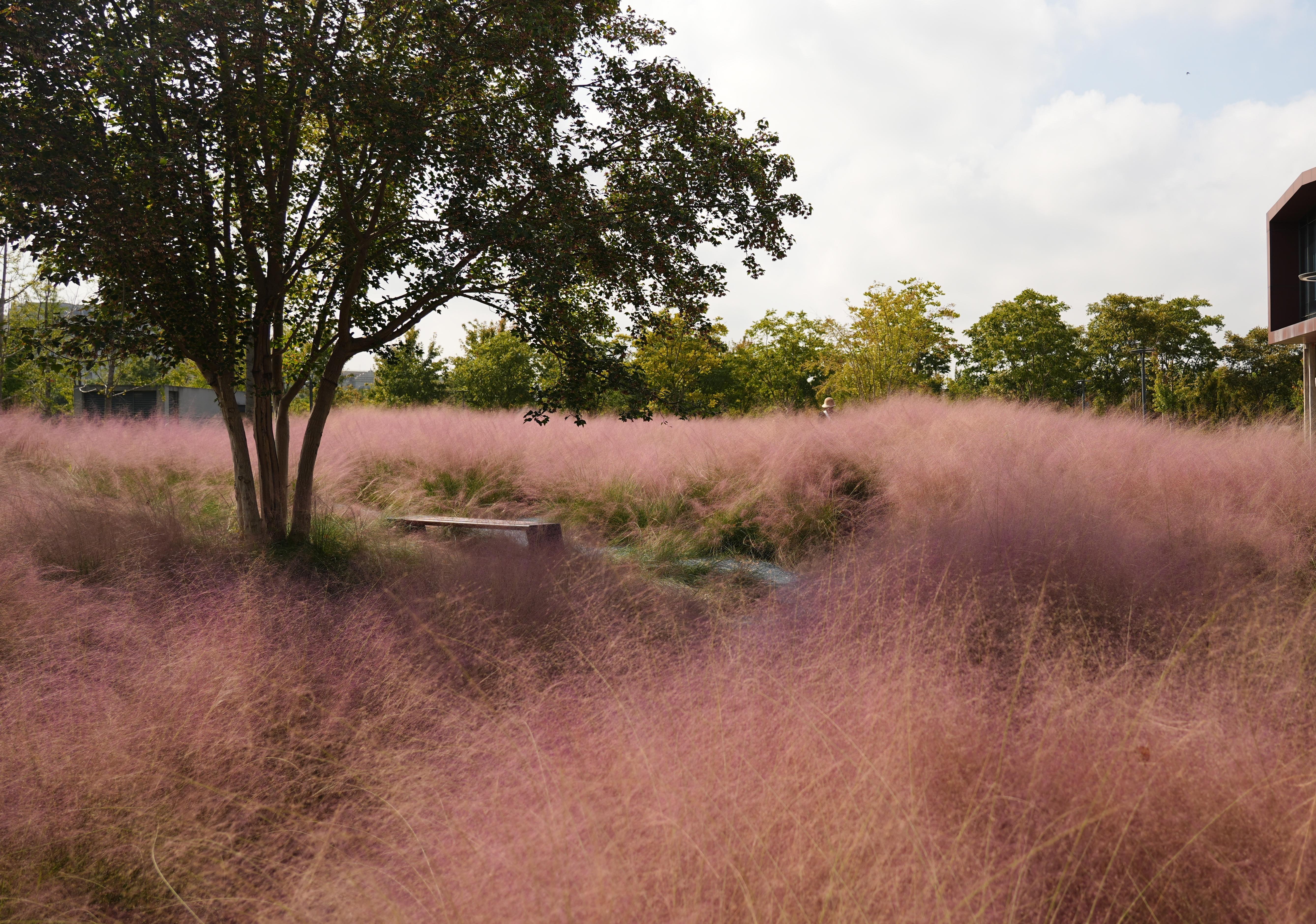 说起这秋天最特别的颜色,当属公园北侧(近同普路)的粉黛乱子草花田。这片占地面积约200平方米的花田,云雾状的花絮在秋风中摇曳,形成海浪般的粉色景观。