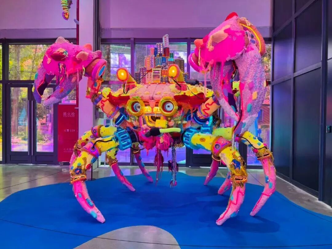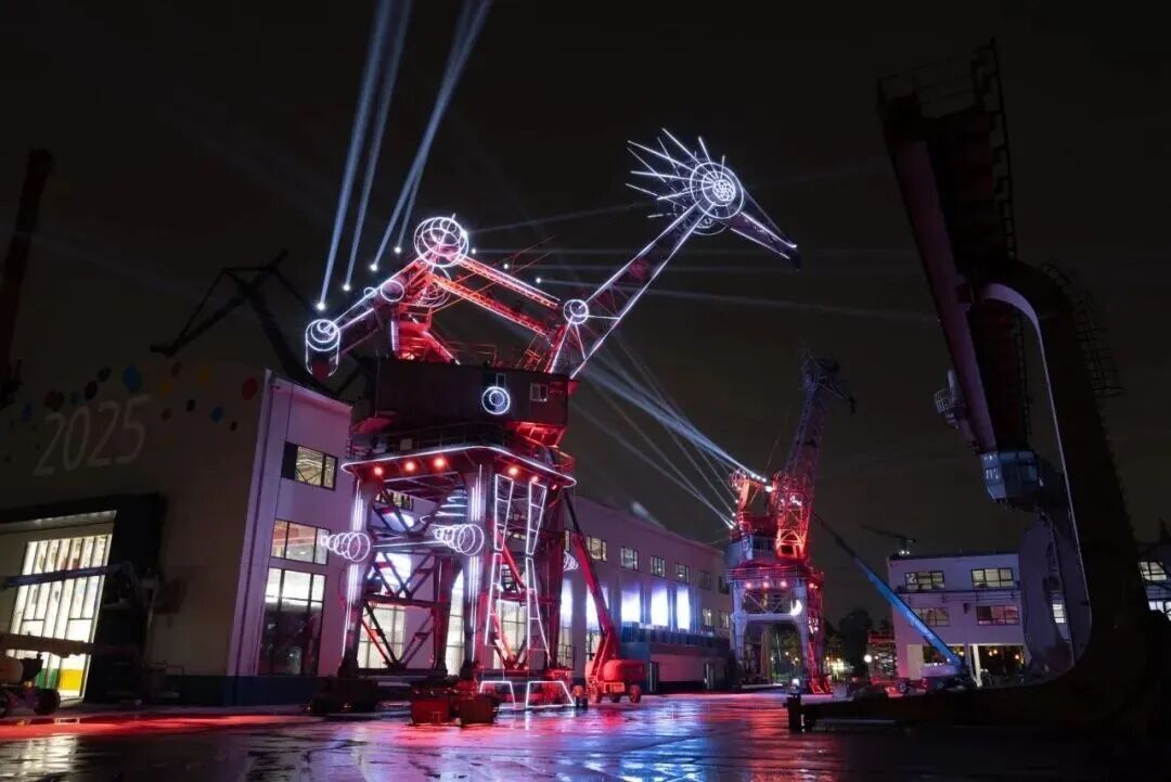 李女士口中的“大型机械”是曾经轰鸣的龙骨、行车与塔吊。如今,这些江边的“工业巨兽”不再隆隆作响,而是与灯光、人形立牌、彩色球体结合,成为独特的艺术载体,勾勒出一幅“赛博朋克”般的画面——历史的钢铁骨骼里,注入了未来的灵魂。