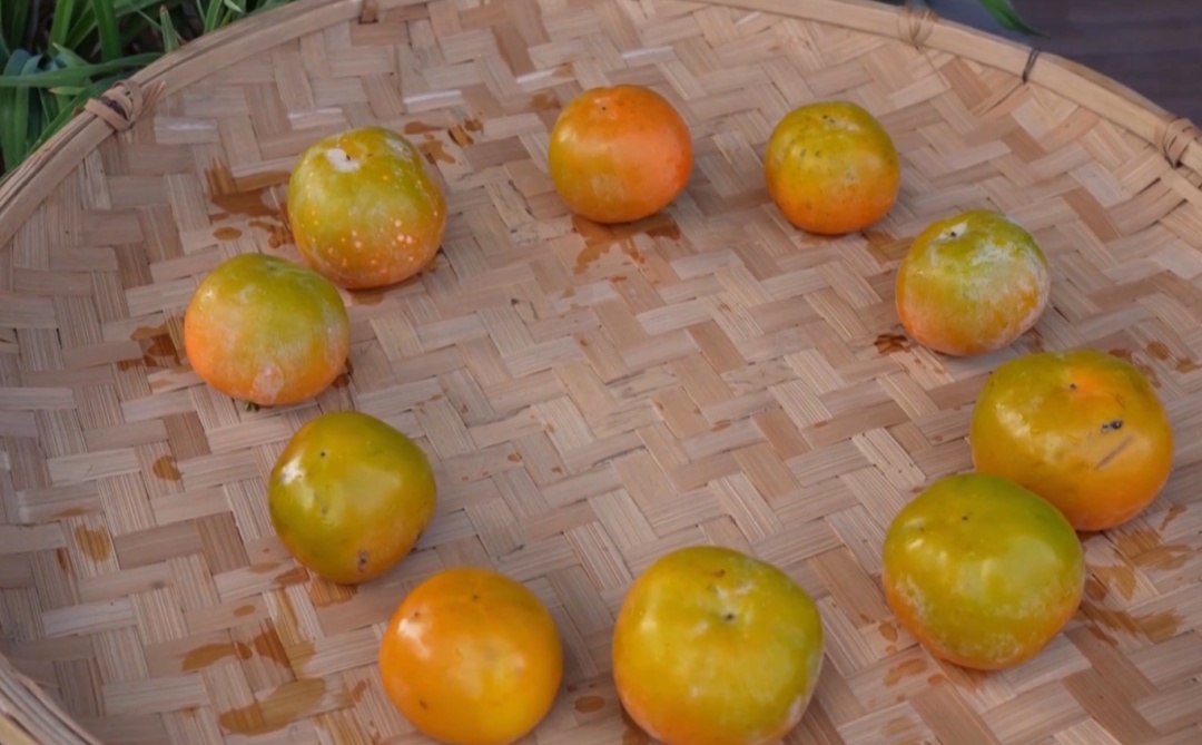 据她介绍,制作优质柿饼的第一步是精心挑选柿子,果皮要橙红鲜亮、果蒂圆润不凹陷,捏起来稍硬但略有弹性,这样的果实糖分足、水分匀,晒出来的柿饼才能软糯不涩、甜度刚好。她特意将新鲜的柿子摊开在竹匾上二次分拣,剔除虫咬、有黑斑或过生过熟的果实,每颗用于制饼的柿子都是“优等生”,这是保证口感的关键。