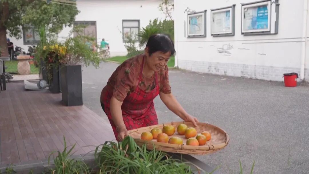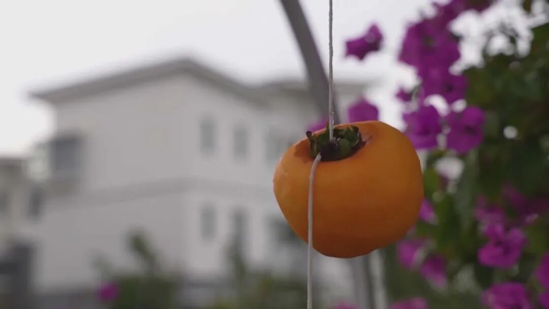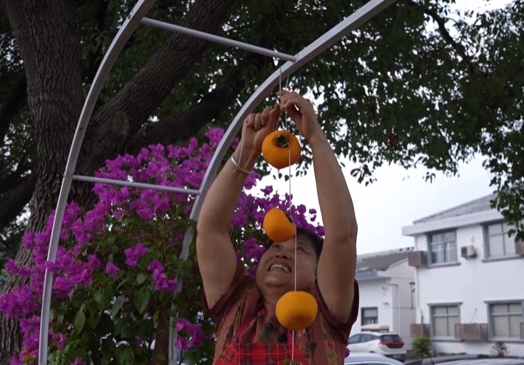 在金汇镇新强村,一串串系着牢固绳子的柿子正沐浴在秋阳下,橙红的果皮逐渐褪去水分,透露出质朴的乡村风情。
