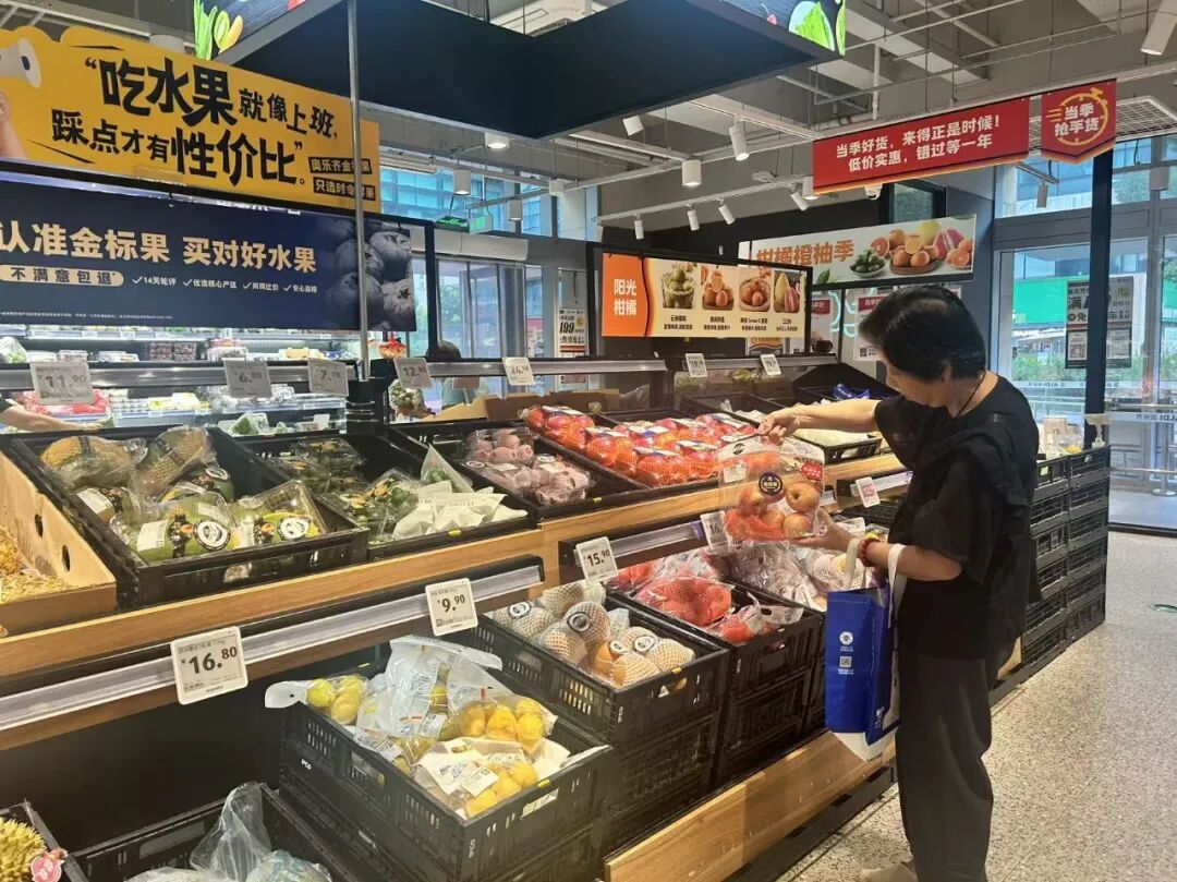 不远处,几个大学生推着购物车在水果区流连,“这里的蓝莓品质好,价格也公道,我们买回去补充维生素。”一位年轻妈妈则挑选了一盒贴有“金标果”的福建三红蜜柚放进车中。