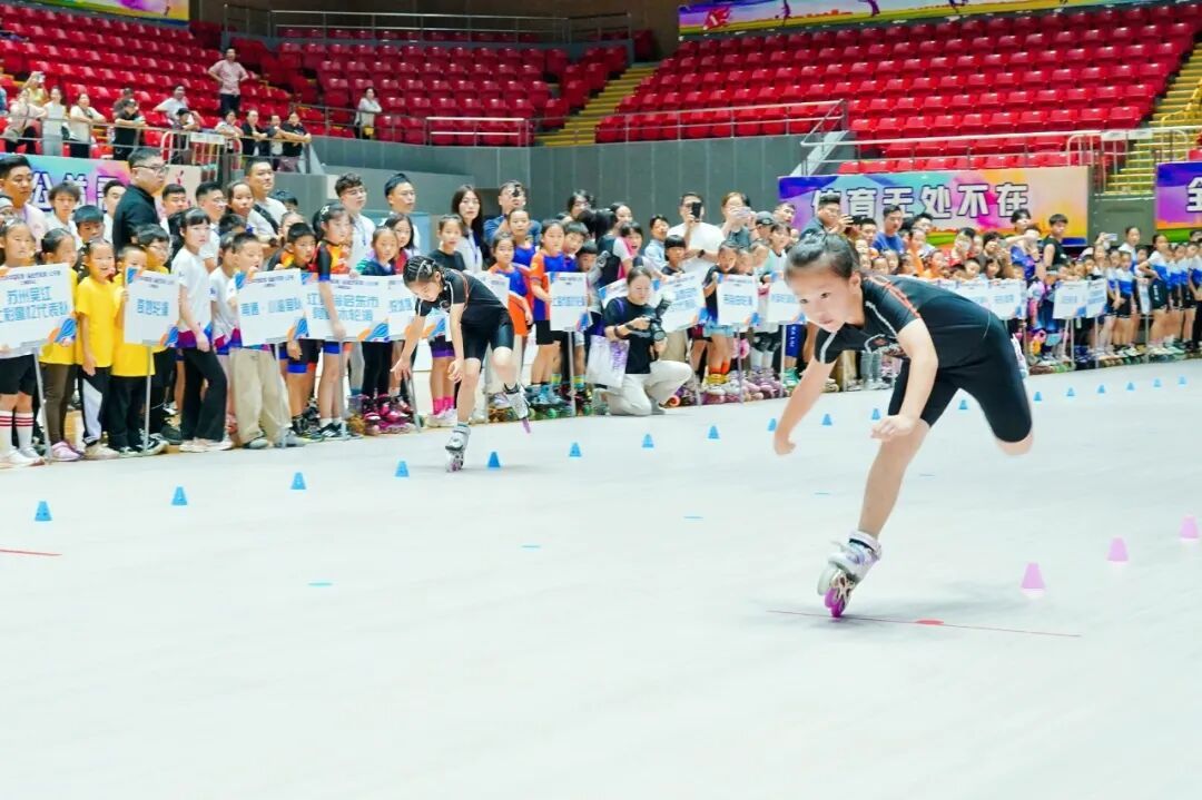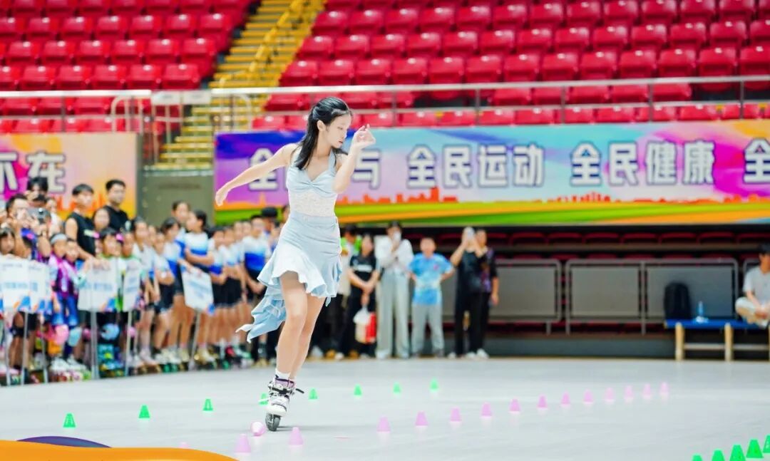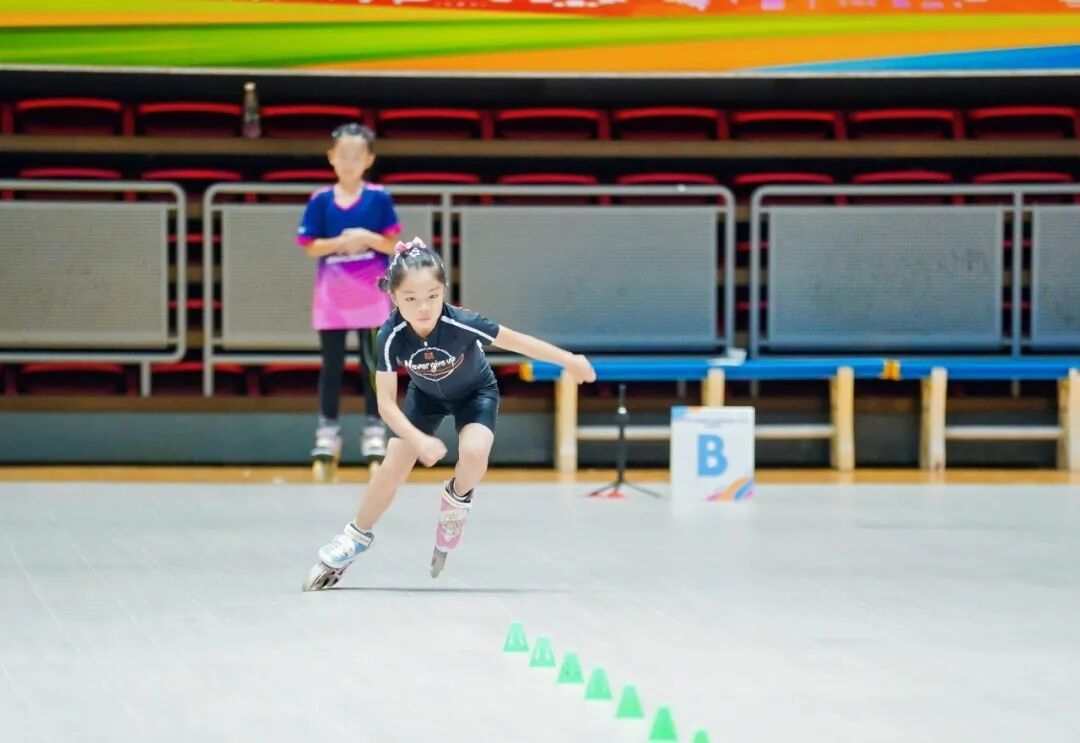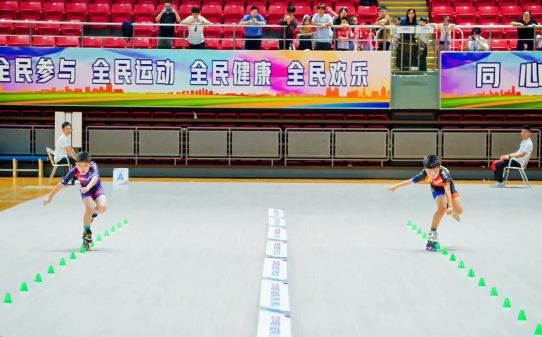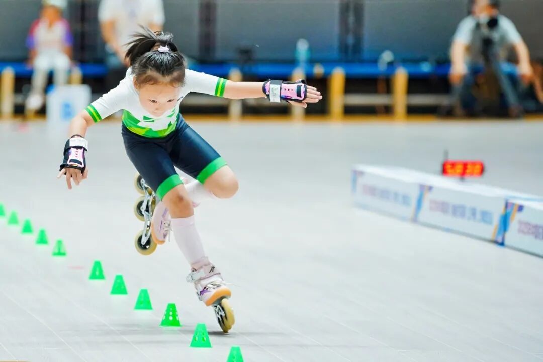 流畅的过弯、精准的压刃……上午9点半,首轮速度过桩对决开启,选手们单脚支撑,如离弦之箭在间距不到80厘米的隔离桩间展开极速穿梭。当轮滑鞋以毫米之差惊险过桩,瞬间引爆全场欢呼,完美诠释了速度与精准的融合。