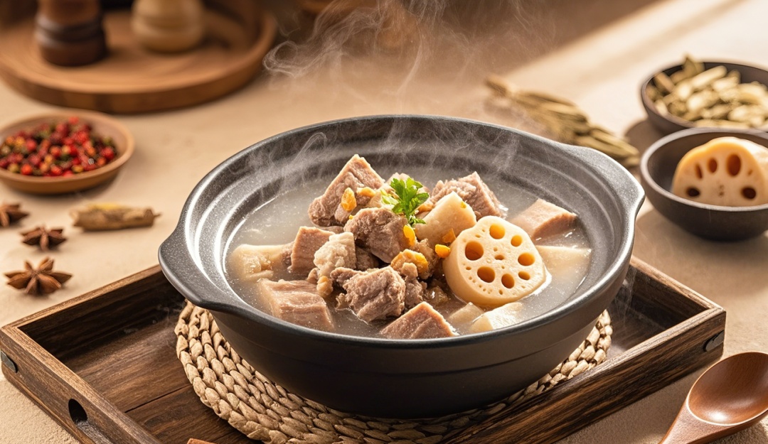党参具有补中益气、健脾益肺的功效。百合与玉竹,二者协同,具有养阴润肺、生津止渴、清心安神的功效。莲藕煮熟后由寒转温,健脾功效增强,其富含的黏液蛋白和膳食纤维对脾胃有益,并能改善汤的口感,使药力温和持久。