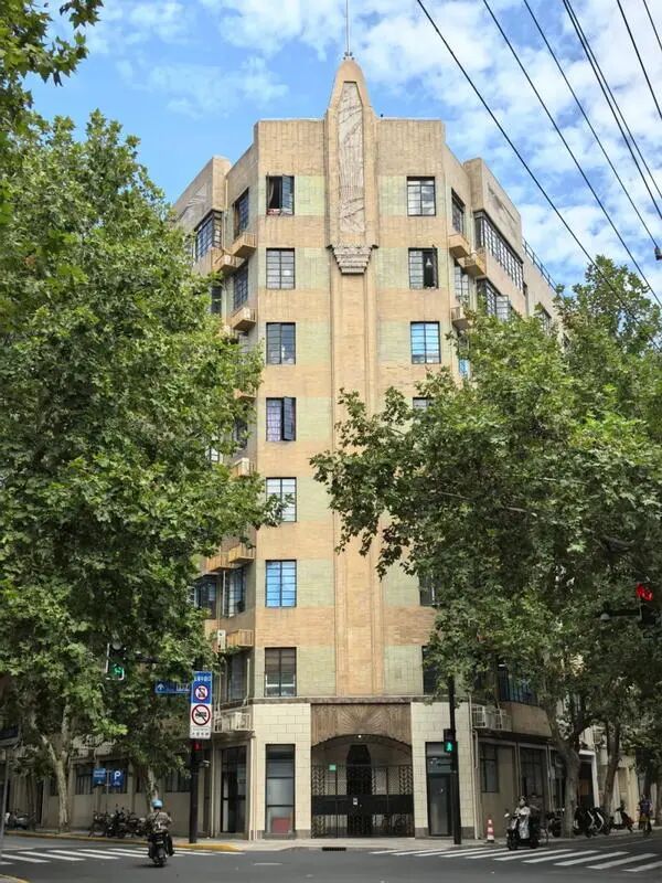 南昌大楼位于南昌路与茂名南路路口,建造于1933年。站在我们这个角度来观察,是不是感觉这栋楼的拐角似乎被切了一刀,并且把切出来的这一面做成了这栋楼的主立面。这样设计主要有两方面原因:首先是结合地形布置,从地图上就能看出,建筑是完全贴合道路所建的。另外切出来的立面开面不大,加上它一共有8层楼之高,一眼望去就显得瘦长,可以在视觉上拔高建筑。