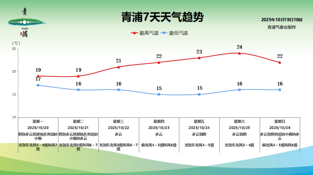 青浦区今天以多云为主,局部地区伴有短时小雨,雨势较弱,北到东北风4-5级,下午起增大至4-5级阵风6级,最高气温22.6℃。明后天受短波槽影响,云系较多,局部地区仍有弱降水;受冷空气影响,10月22日前有持续大风,气温较前期明显下降,早晚体感凉,请及时增添衣物。10月22日起以多云天气为主,气温略有回升。