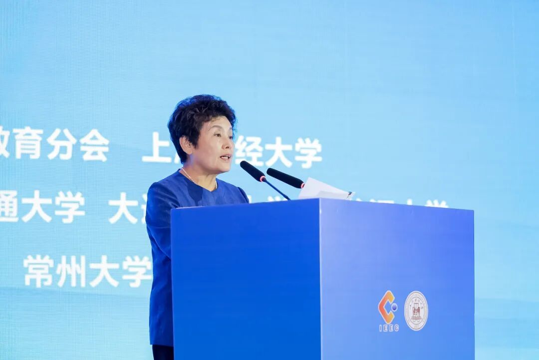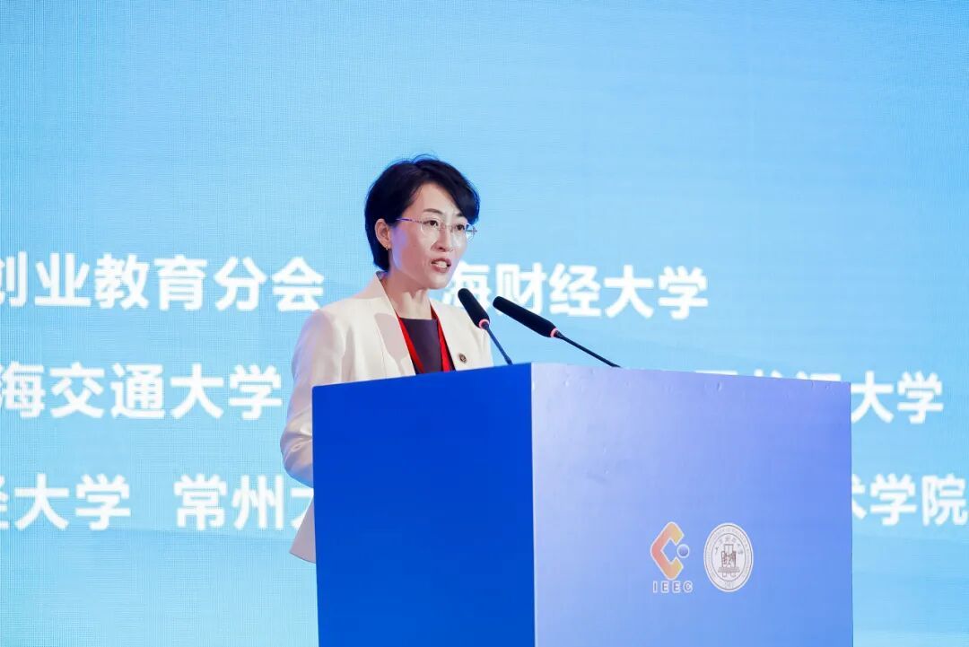 上海财经大学副校长靳玉英代表学校对会议召开表示祝贺,她系统介绍了我校正在开启的数智财经战略新篇章,回顾了我校“服务+”创新创业教育特色和取得的教学成果。