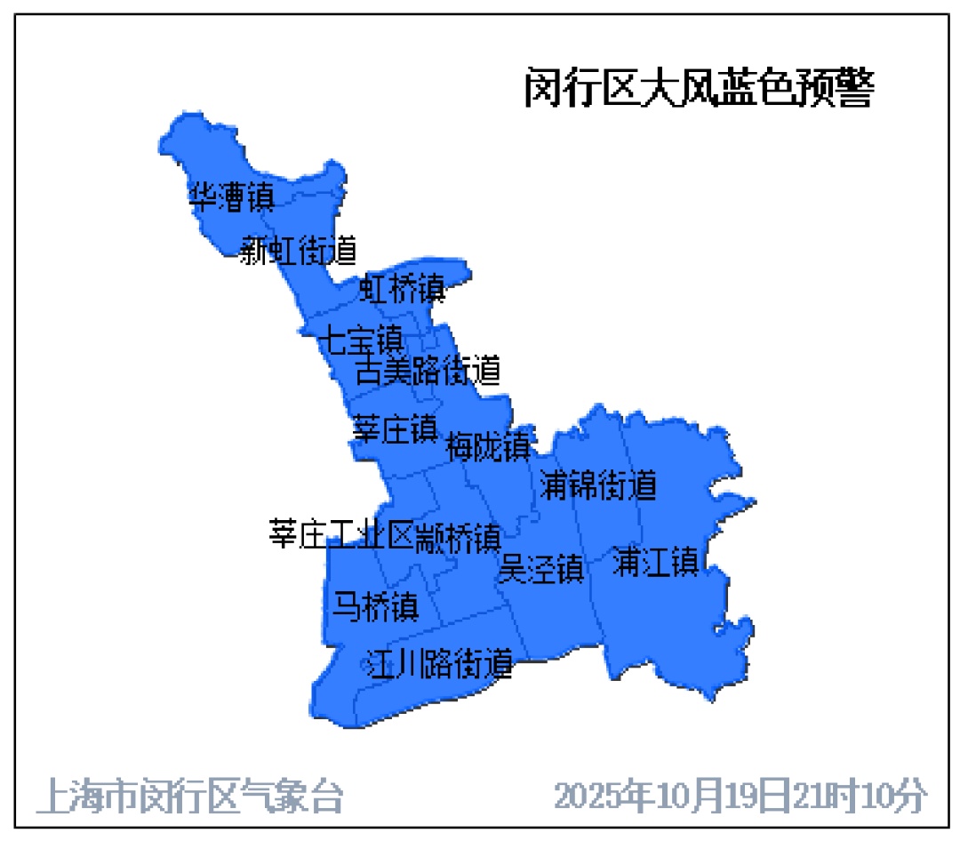 上海市闵行区气象台2025年10月19日21时10分发布大风蓝色预警信号:
