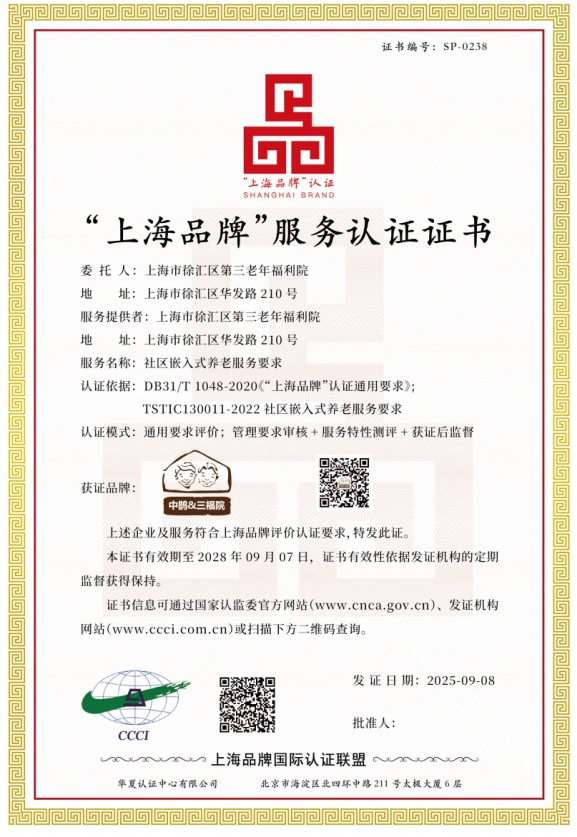 徐汇区第三老年福利院成功荣获“上海品牌”认证