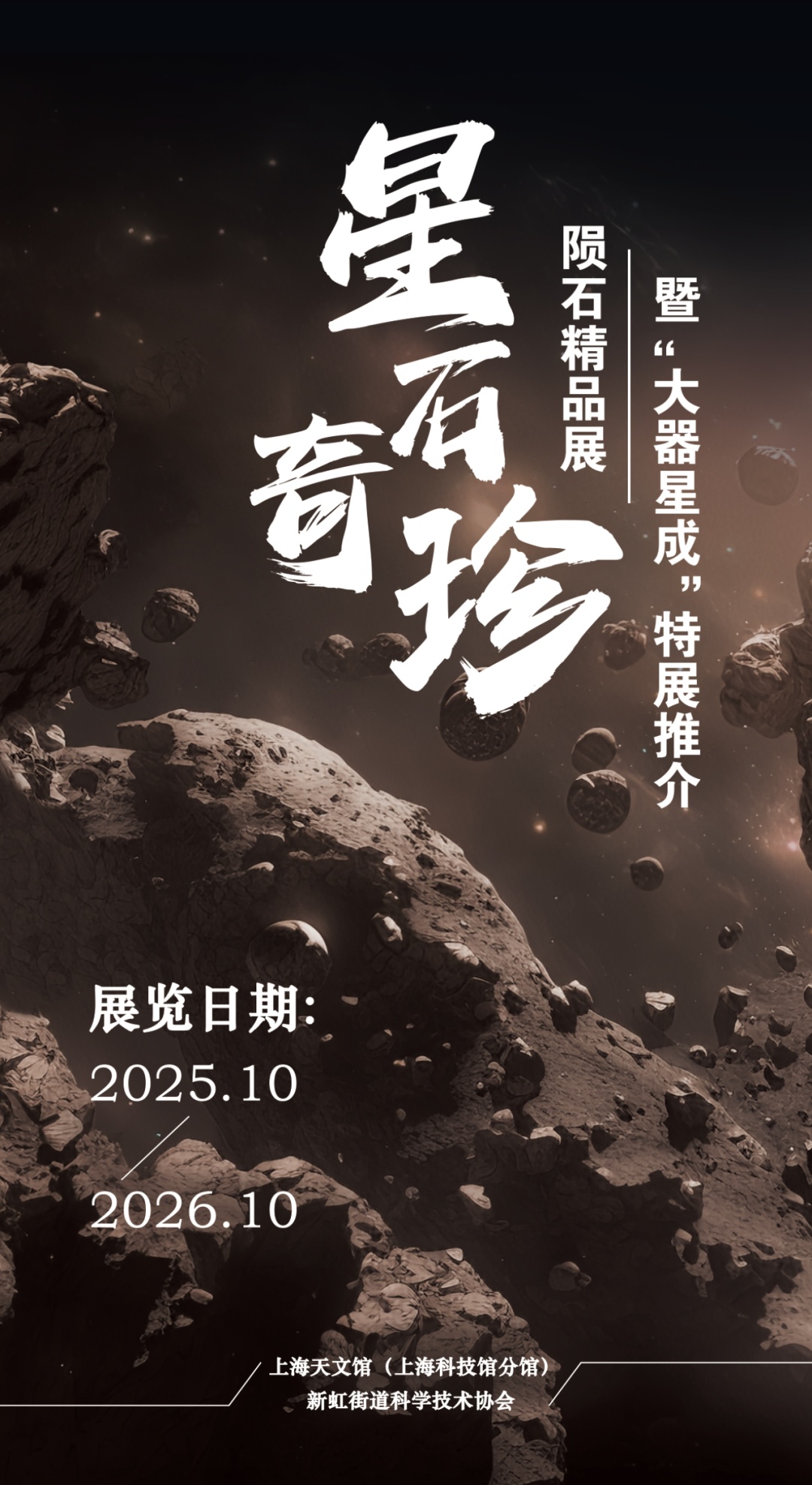 曾经穿梭于商圈的过街天桥,如今化身为一条连接宇宙的“星际走廊”。在这里,天外来物与人类文明交相辉映,珍稀星石与上古神兽共谱“万籁寂”……这场别开生面的星石奇珍科普展,为新虹街道的“15分钟科普生活圈”点亮了一片璀璨星空。 本次科普展由新虹街道科学技术协会携手上海天文馆(上海科技馆分馆)共同打造,通过沉浸式探索体验,让科学知识在漫步中触手可及。在这里,不仅能看到上海天文馆珍稀的陨石标本,还能在科学的解读中领略陨石的奥秘。 解码陨石的奥秘 陨石作为宇宙馈赠的“时空胶囊”,承载着太阳系形成的原始密码。展览通过图文诠释陨石的来源、种类、内部密码,讲述宇宙与人类跨越千年的故事! 图为部分展出内容 观展指南 观展地点:申长路869号虹桥龙湖天街A馆2层连接虹桥天地购物中心天桥 ⏰观展时间:24小时不打烊!欢迎随时赴一场星际之约! 相约新虹 在空中连廊上 解锁星际奥秘 感受科学魅力