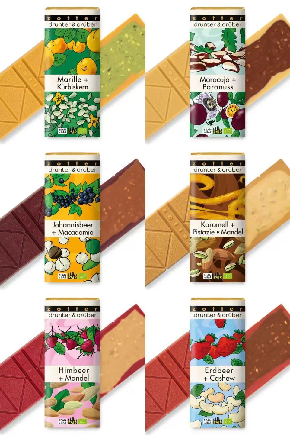 此次首发的“双果狂欢”系列,聚焦果香与坚果香的融合,外层采用珍得巧克力工厂“水果到巧克力”(fruit-to-bar)工艺制作的巧克力壳或多彩水果涂层,迷人色彩完全源自浆果等天然水果;内馅则以 “坚果到巧克力”(nut-to-bar)工艺打造,选用新鲜烘焙坚果、纯可可脂与优质巧克力制成多样手工夹心软糖,能清晰品尝到高品质坚果的醇厚风味与高坚果含量的扎实口感。整体还添加大量坚果碎与酥脆果粒,带来丰富咀嚼感。