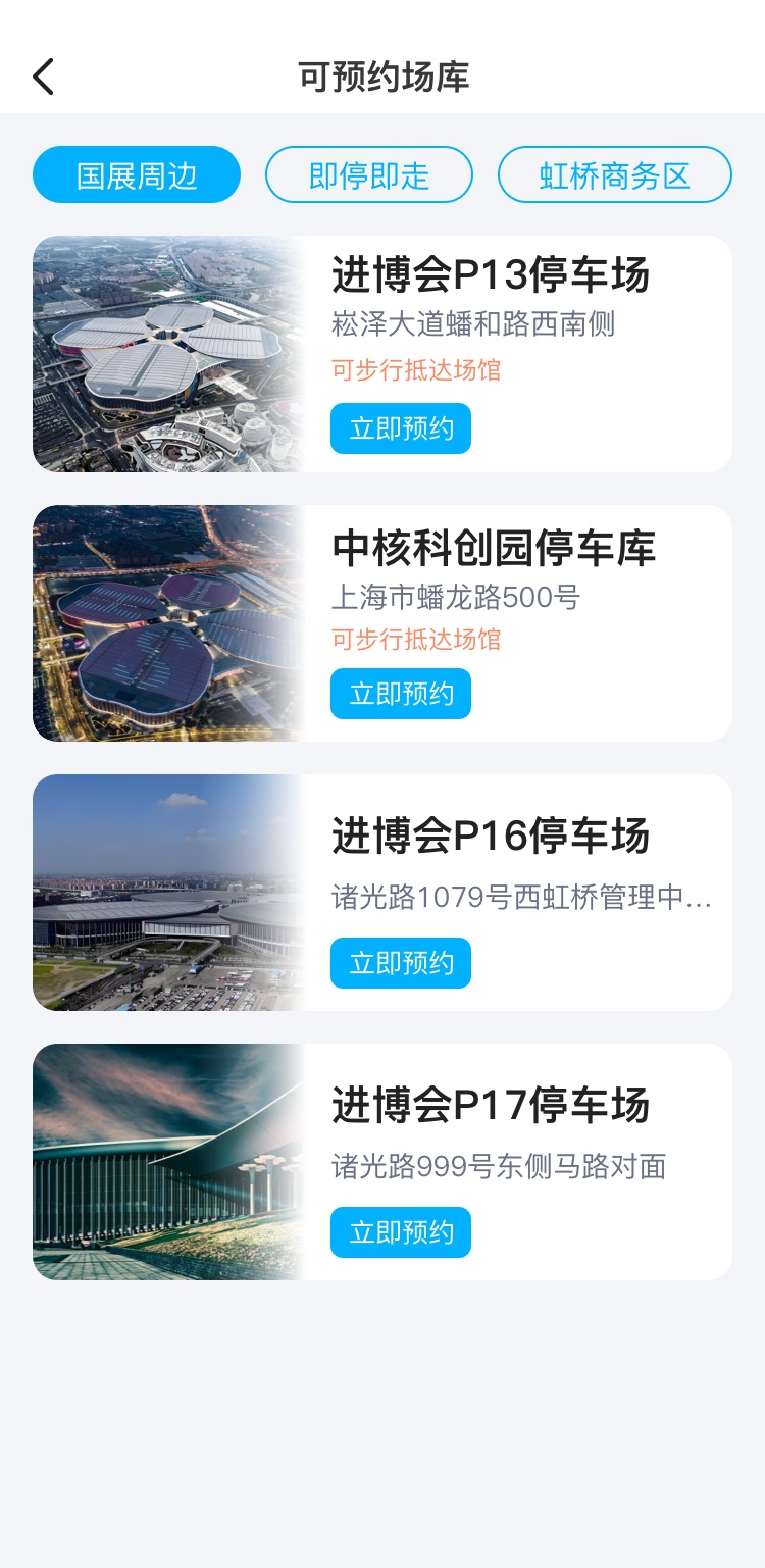 点击“停车预约”,选择相应的区域(国展周边、即停即走、虹桥商务区)及具体的停车场,点击“立即预约”↓