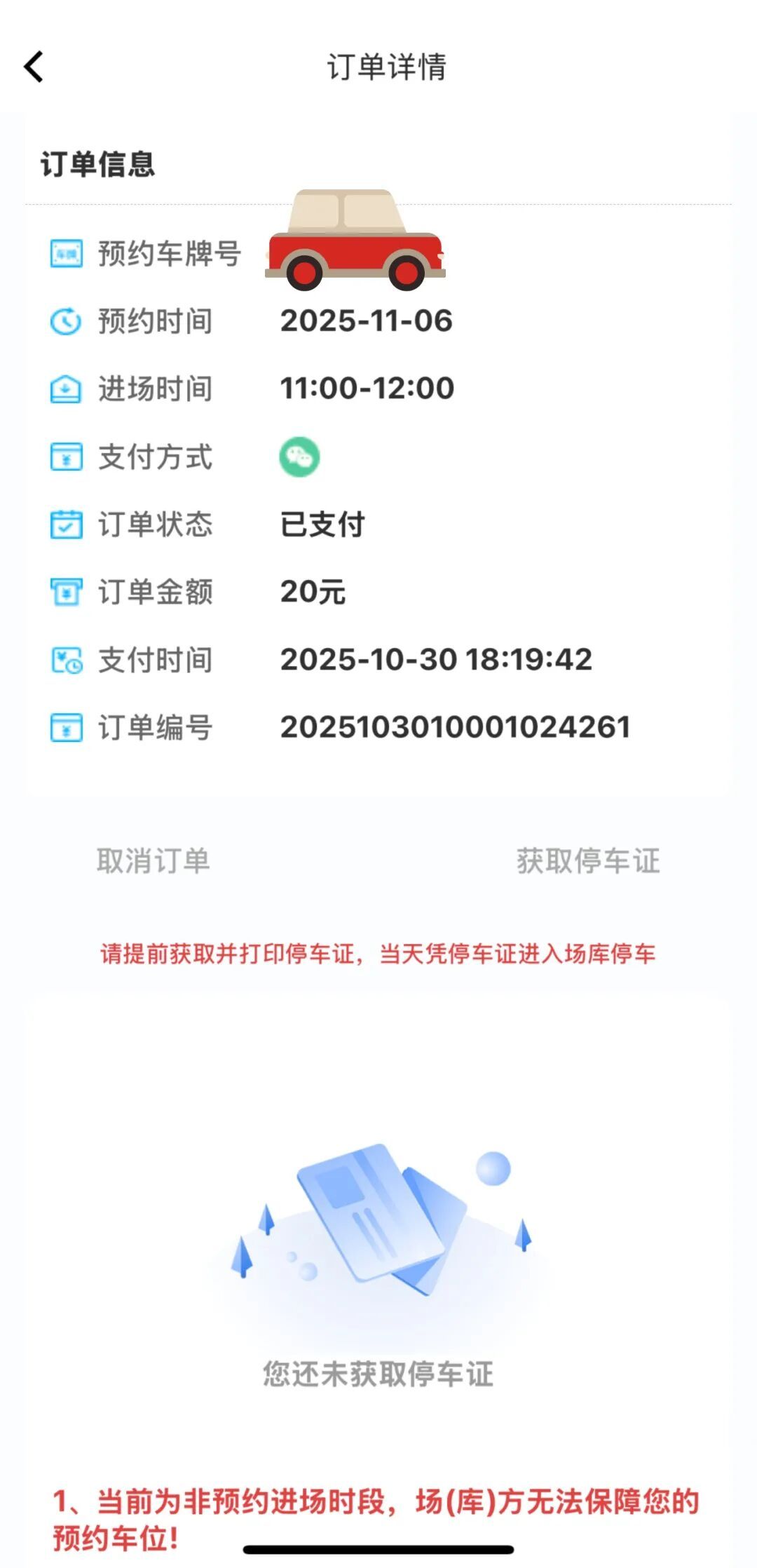 请注意哦!出行前,可提前打印停车证,也可在首页“待办提醒”中获取电子停车证。