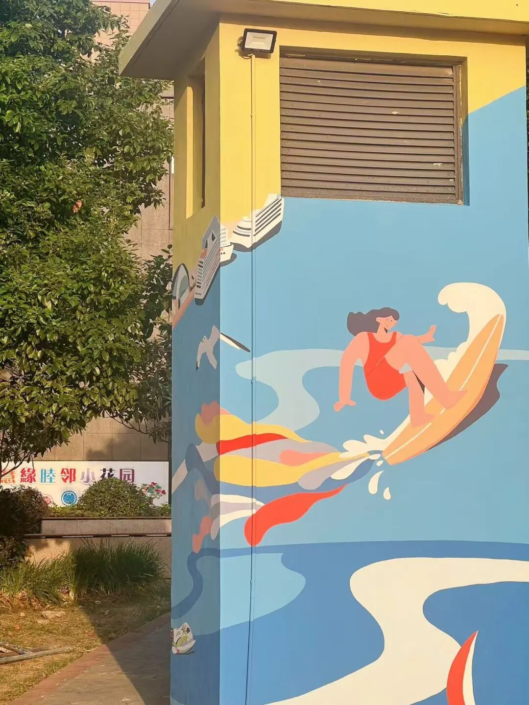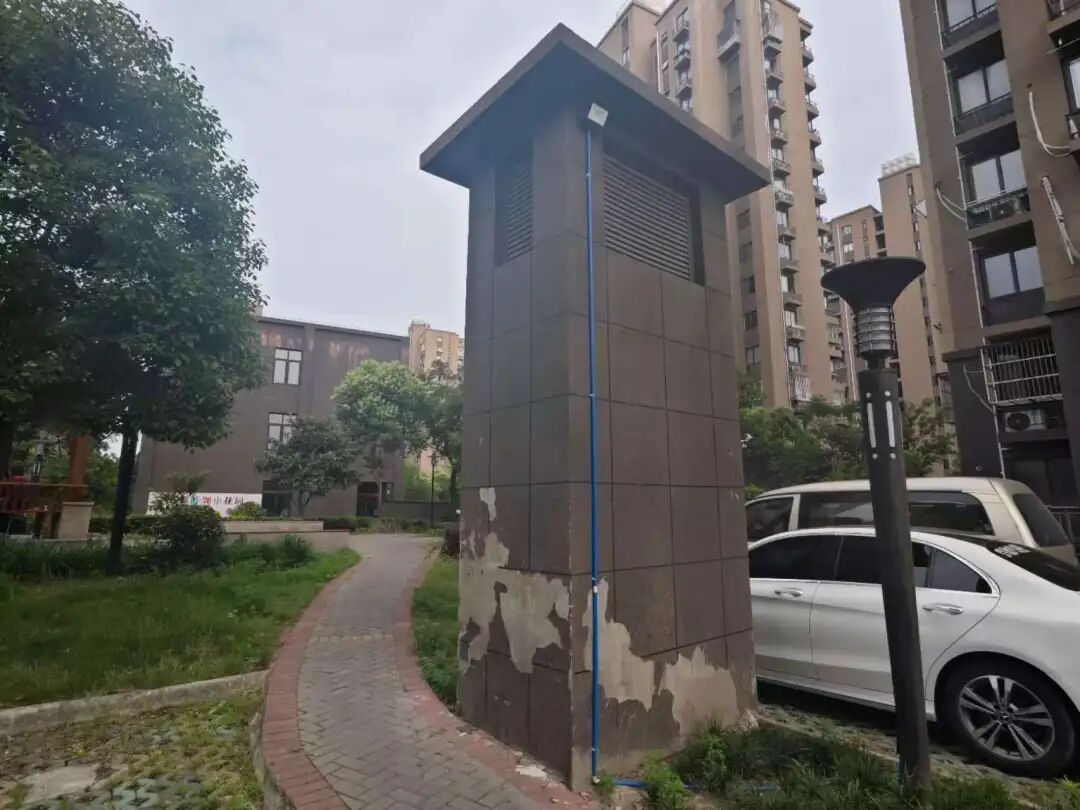 “慧游亭”作为小区标志性休闲空间,一直是居民闲暇时间聊天看书的第一选择,但其旁侧的通风井墙体长期裸露、色彩暗淡,与周边景观格格不入,成为社区颜值的“小瑕疵”。了解该情况后,慧苑居民区党支部第一时间与共建单位沟通,上海吴淞口国际邮轮旅游度假区党支部积极响应,选派2名具备专业彩绘资质的员工组建志愿服务队,承接墙体焕新任务。