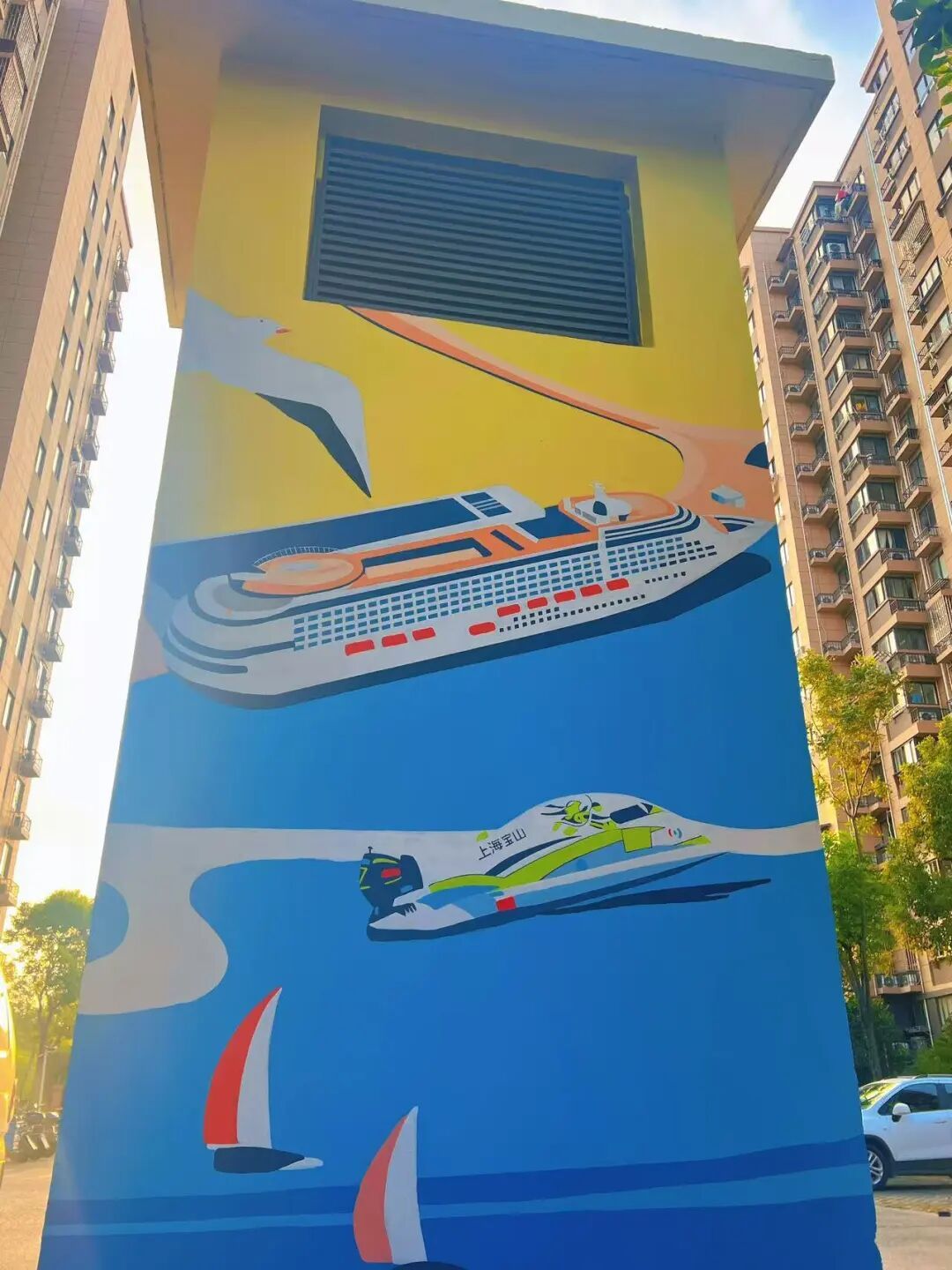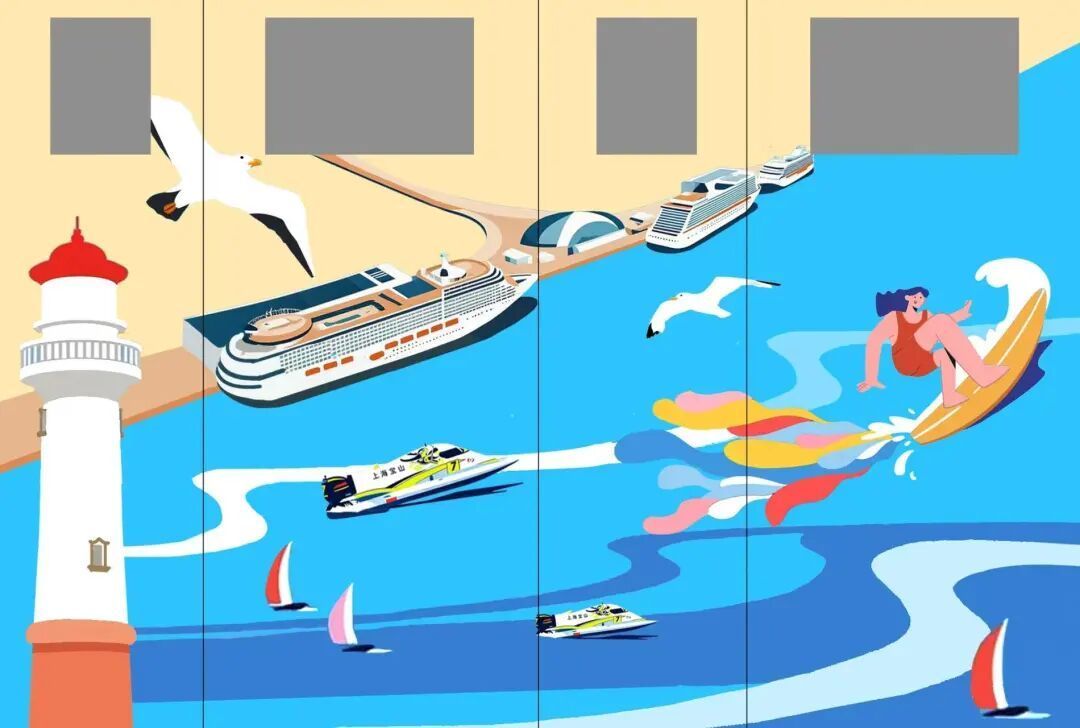 结合“慧游亭”的邮轮元素,双方精心设计了以“邮轮风情·活力水岸”为核心的彩绘方案,将上海吴淞口国际邮轮港的恢宏景致、海鸥翱翔的灵动姿态、摩托艇疾驰的动感瞬间与冲浪者逐浪的活力身影融为一体,用视觉艺术延续邮轮文化记忆。施工期间,专业彩绘人员携带专业颜料与工具驻场作业,从墙面预处理、色彩调配到细节勾勒层层推进。经过两天的努力,原本灰暗单调的墙体焕发出勃勃生机——湛蓝底色上,巨轮扬帆欲航,海鸥掠过天际,水上运动场景栩栩如生,与“慧游亭”形成“一亭一墙”的景观呼应,引得居民纷纷驻足拍照。
