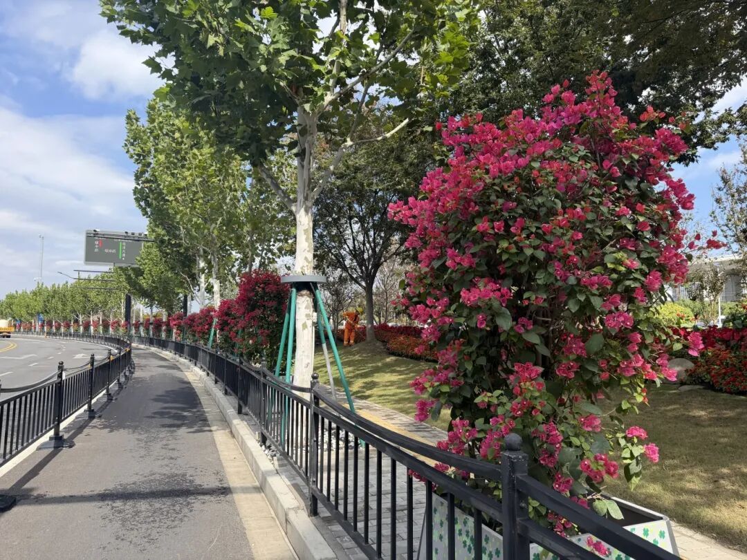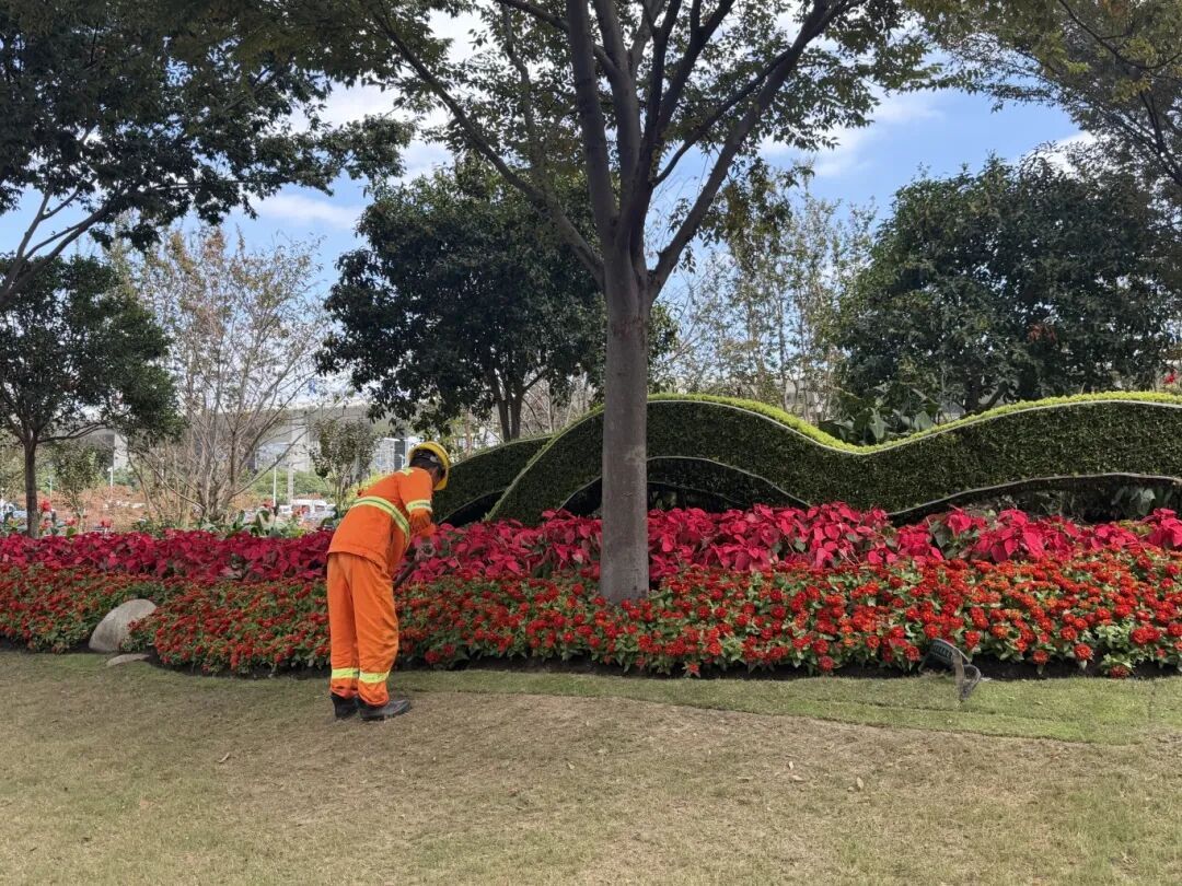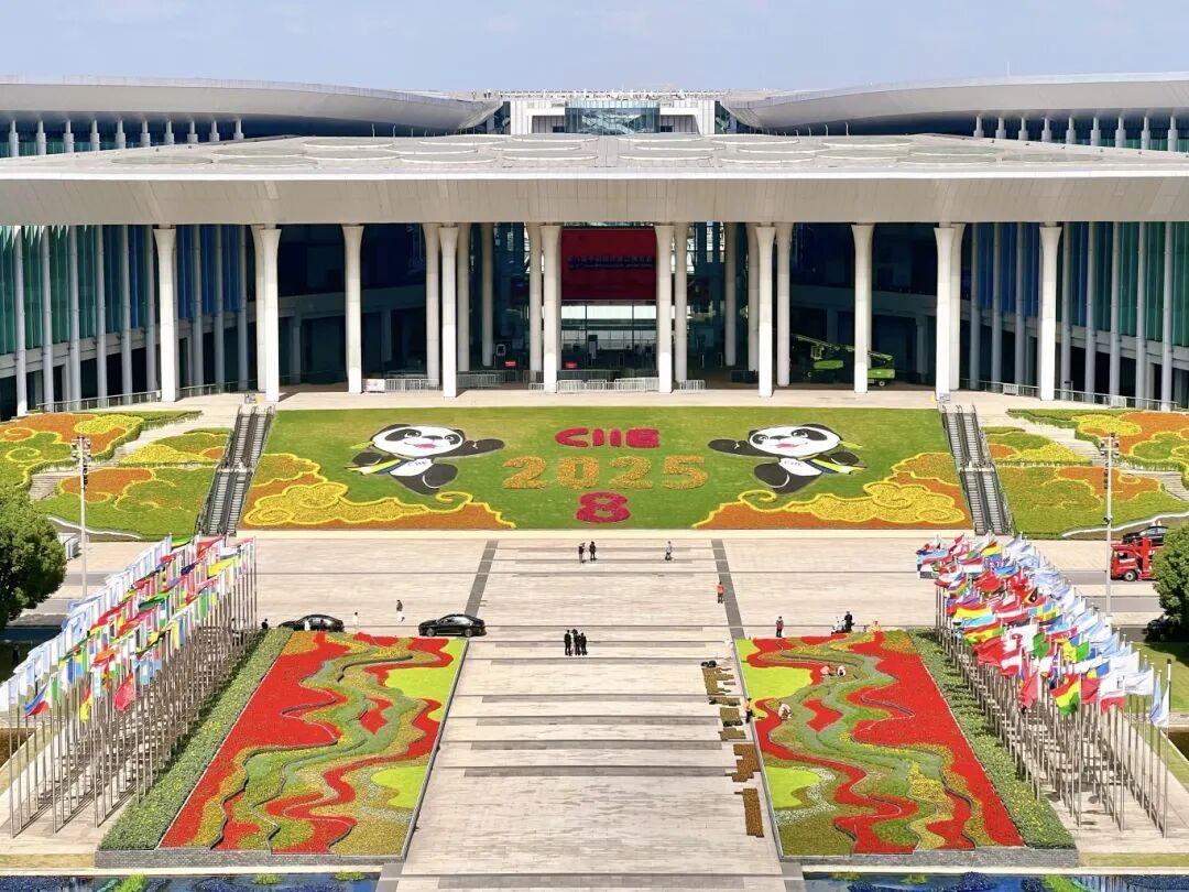 进博会外场绿化北起崧泽高架,西至诸光路,南达盈港路,东接涞港路,构成一幅气势恢宏的“城市迎宾画卷”。今年外场以“国际化、生态化、景观化、精致化”为设计理念,将常态绿化、节庆花境与夜间灯光有机结合,打造出“多彩进博”“喜迎进博”“共迎未来”“进博之光”“进博之环”“进博之彩”六大主题节点。红黄主调的当季花卉,通过组合花箱、灯杆花球与花境小品等形式,呈现出层次丰富、温暖热烈的视觉效果。 内场南广场延续“云山—梯田花海—河流—现代城市花园”的经典景观结构。52万余盆鲜花构筑成壮观的“梯田花海”,烘托出喜迎世界宾朋的盛情。今年内场设计有两处重要优化:云山区域适当缩减摆花面积,拓宽人行空间;梯田花海的色彩搭配更为协调,黄色与橙色花卉过渡自然,韵律感更强。“进宝”与“2025”“CIIE”“8”等标识点缀其间,点明进博会主题。 据上海建工园林集团绿建公司进博会项目负责人陈钦介绍,国家会展中心(上海)内场与外场的绿化景观在白天与夜晚呈现出不同的视觉效果。日间,雕塑与错落有致的花境、造型景石相互映衬,增强了景观的层次感与艺术表现力;到了夜晚,灯光系统精准塑造视觉焦点,使植物的色彩与层次在夜色中依然清晰明亮,真正实现了“日夜皆景、全时可赏”的迎宾效果。 从外场的“迎宾画卷”到内场的“梯田花海”,第八届进博会的绿化景观在节点塑造、灯光联动和色彩把控上实现了全面提升。这些精心打造的景观将以更加亮丽的姿态,迎接进博会的盛大开幕。