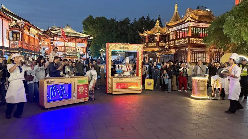 “铛铛铛——”上海豫园商城化身“美食总动园”现场!抡勺敲盘、锅碗协奏,声声唤醒食客味蕾。铁板滋滋作响,小笼包蒸腾的热气裹着肉香直钻鼻腔,引得人“垂涎三尺”。