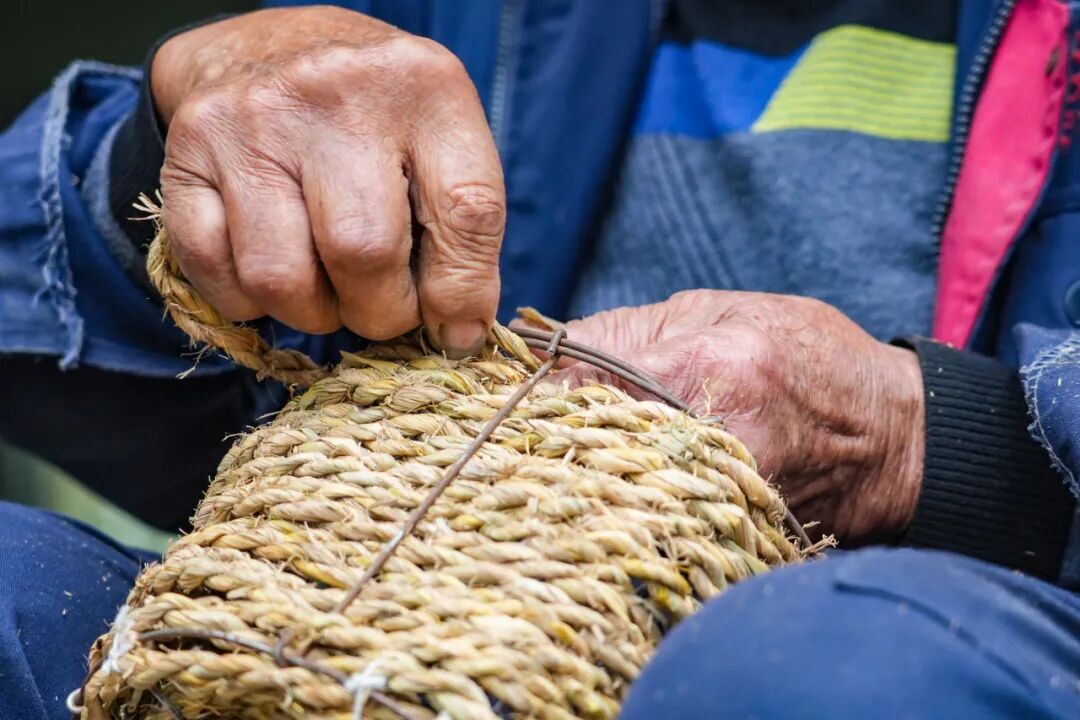 “现在这些稻草,不是还田就是当柴烧,可惜了。”沈师傅一边说着,双手却不停歇。只见他的手指在金色的稻草间灵活穿梭,持续添草、续接、搓捻,动作流畅得如同呼吸。转眼间,一根均匀结实的草绳就在他掌间成型了。这还不够,他拿起准备好的骨架,开始一圈圈地盘旋编织,一压一挑之间,一个朴拙实用的稻草菜篮渐渐显露出模样。
