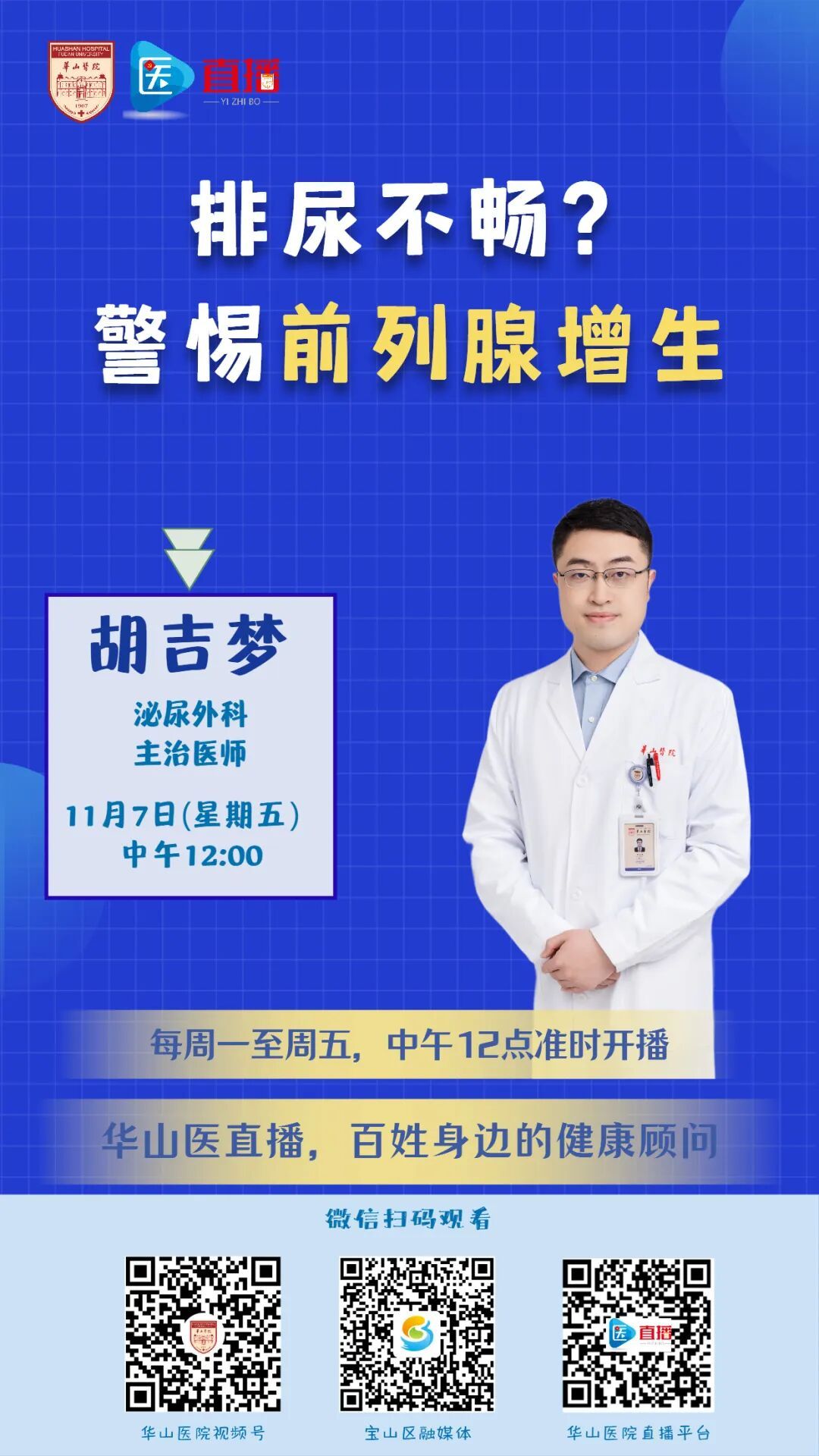 许多超过50岁的男性,经常抱怨:“我以前小便很好的,最近几年来小便次数变多了,尤其是晚上可能会起夜3-4次;小便的时候尿线变细了,滴滴答答地经常感觉尿不干净;在马桶前一站就是2分多钟,想小便时又会急着找厕所,一不小心会尿湿内裤”。那么这些朋友,很可能是患了良性前列腺增生症,本期医直播,复旦大学附属华山医院泌尿外科主治医师胡吉梦,带大家更深入地了解良性前列腺增生症。
