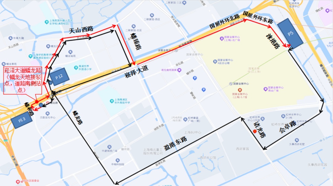为进一步满足展会期间的停车需求,区交通委会同虹桥商务区管委会全面摸排梳理公共停车场资源,进博会期间工作日可提供5000个预约泊位,双休日预约泊位数量将提升至8000个。针对虹桥枢纽大客流应急交通保障要求,闵行区交通委已规划开设2条进博会专属接驳专线,构建“停车场—枢纽—核心区域”的便捷交通网络。其中一条专线连接P13、P12停车场及蟠龙天地至P5停车场,另一条专线则实现P5停车场与虹桥机场、虹桥火车站(出发层)的直达衔接,有效提升停车与轨交、航空枢纽的换乘效率。此外,闵行区还重点推进进博会周边公交站点配套设施维护工作,对核心区域公交三角杆、信息牌、旗牌等设备进行全面更换,确保公交服务标识清晰、运行有序。