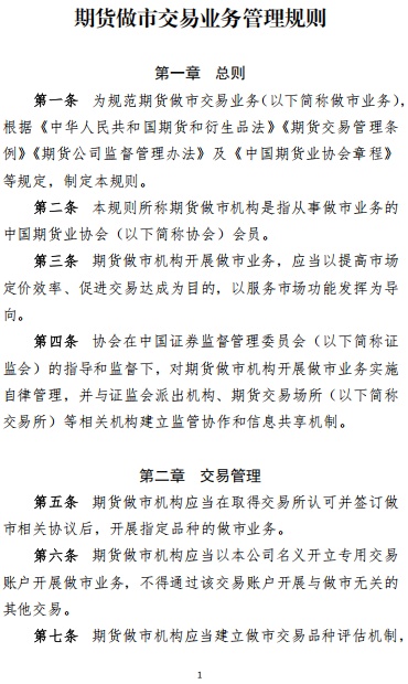 三是提升合规管理水平。《管理规则》从做市展业条件、对市场影响以及不当获利等方面,明确业务行为底线要求,禁止业务外包、扰乱市场以及开展违法违规活动等。此外,考虑到《管理规则》主要基于现有制度和行业现状,实际执行难度不大,因此,《管理规则》自发布之日起30日后正式实施,督促期货做市机构加快整改进度,推进业务规范发展。