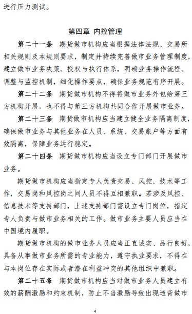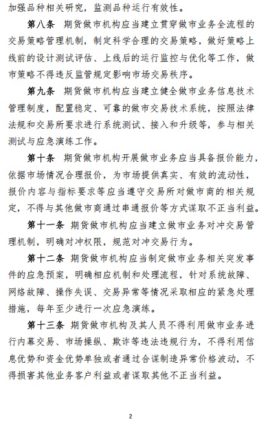 二是细化交易环节管理要求。期货做市机构需要重点加强做市账户、品种与策略评估、报价、对冲、系统、应急等环节的管理,严守业务底线,不得利用做市业务扰乱市场或开展违法违规活动等。