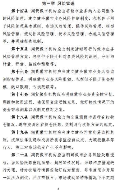 二是增强风险防范能力。《管理规则》在系统梳理做市业务交易、风控、内控等环节管理的基础上,强化全流程风险防范,包括事前对品种与策略的评估,事中对风险限额的监测监控,以及事后对风险异常情况的处理等。此外,《管理规则》还通过明确做市业务与其他业务有效隔离、设置专门部门与人员岗位等要求,规范期货做市机构展业行为,确保业务有序开展。