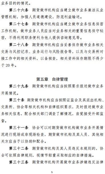 四是强化自律管理职责。中国期货业协会从收取业务信息、加强监管协同、开展自律检查等方面,加大对期货做市机构做市业务的自律管理,提高行业做市业务合规化水平。