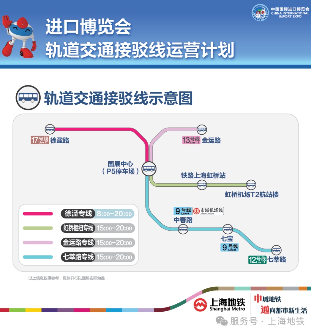 七莘路专线:国展中心P5停车场—9号线中春路站、七宝公交站、12号线七莘路站。