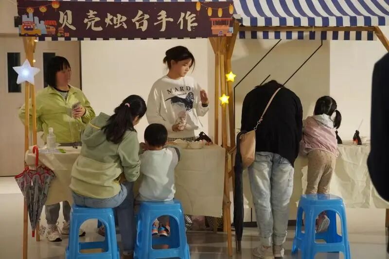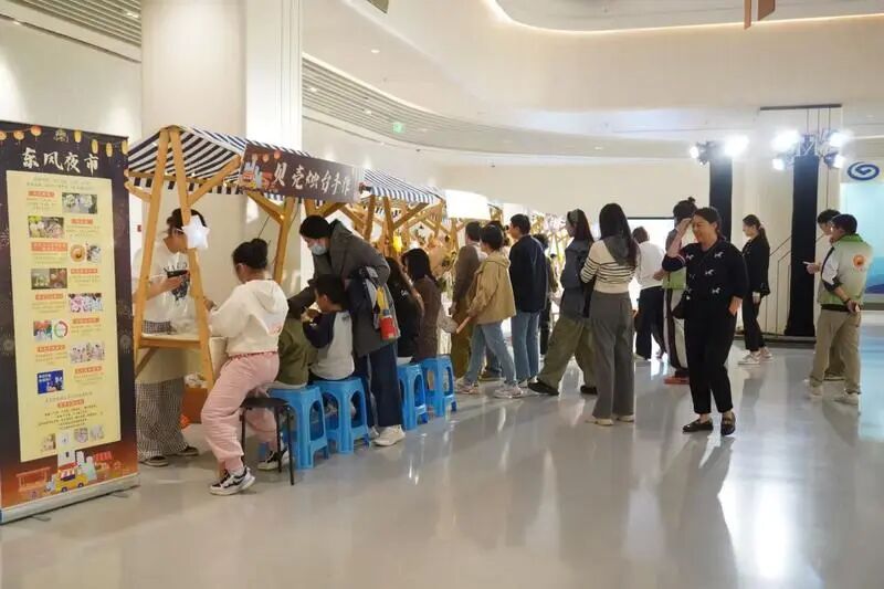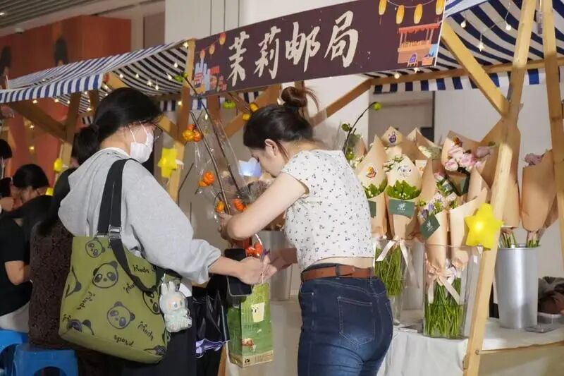 不远处,金融反诈、养老服务等咨询点也围满了人。这些平日里或许要特意跑一趟的事,如今在夜市里边逛边问,就轻松搞定。旁边的手作蜡烛、特色花艺、萌宠互动区,也让人忍不住停下脚步,动动手、聊聊天,疲惫不知不觉就散了。