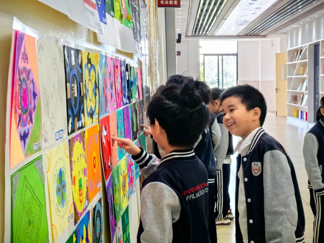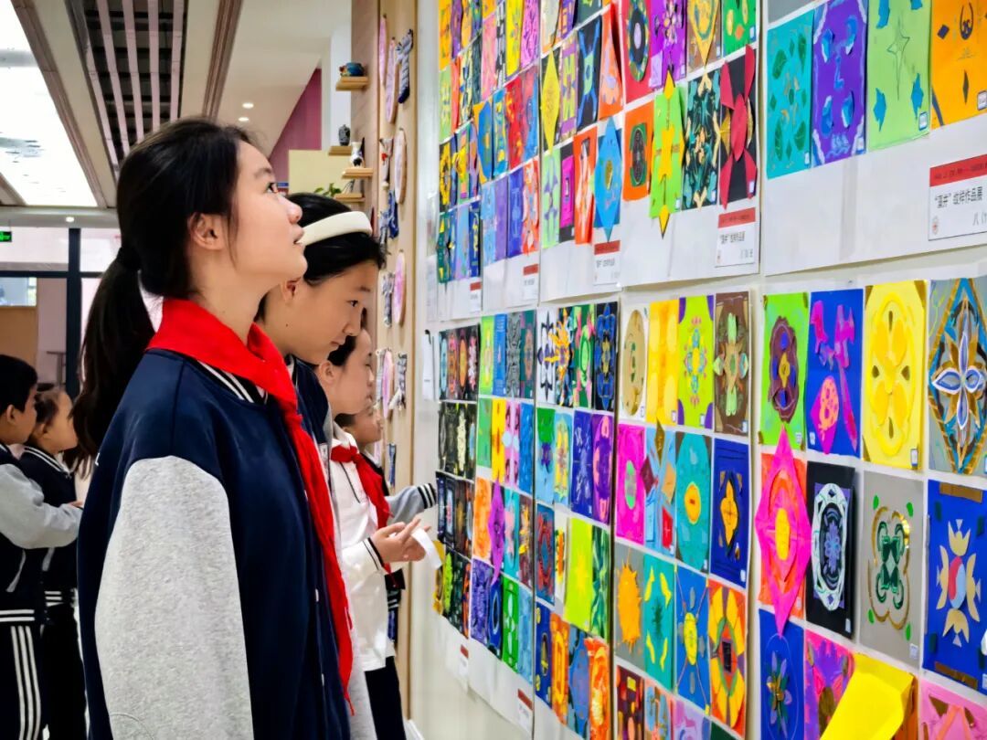 从美术课堂到廊道艺术空间,不仅激发了学生的学习和创作热情,也丰富了校园文化,让孩子们的校园生活更加多姿多彩。采访当天,正巧碰到五(7)班学生张乐颐和与俞晓瑜组团逛展,两人认为,“课间休息过来逛逛蛮好的,很放松。”五(11)班学生窦思羽说:“我上社团课的位置也在这一层,每次下课路过这里都会驻足一会儿,新上的藻井纹样令人震撼!”