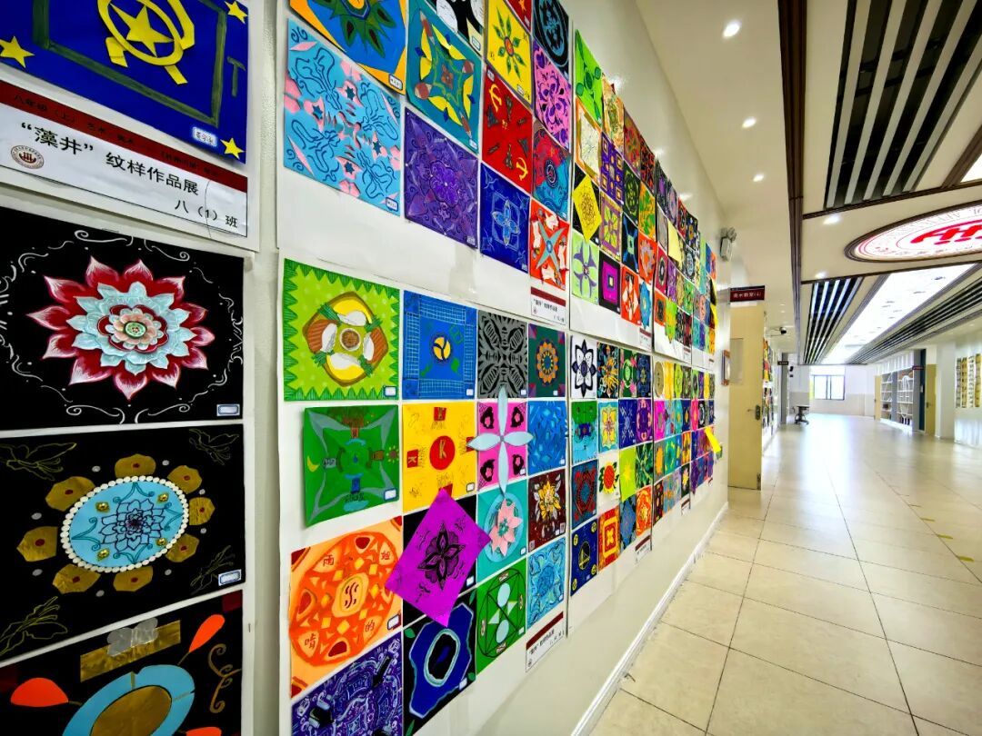 该艺术空间名为“经纬万象+造型空间”,位于学校4号楼3层,美术专用教室也分布于此。师生出了教室就能看展。廊道墙面就是展示艺术作品的空间,书法、陶瓷等艺术作品均陈列于此。步入廊道,八年级学生的藻井纹样作品占了半壁江山,足足有200余幅,手绘、剪纸等形式均有。教师也主导设计了AI藻井纹样动态视频,开发了藻井纹样魔方等。