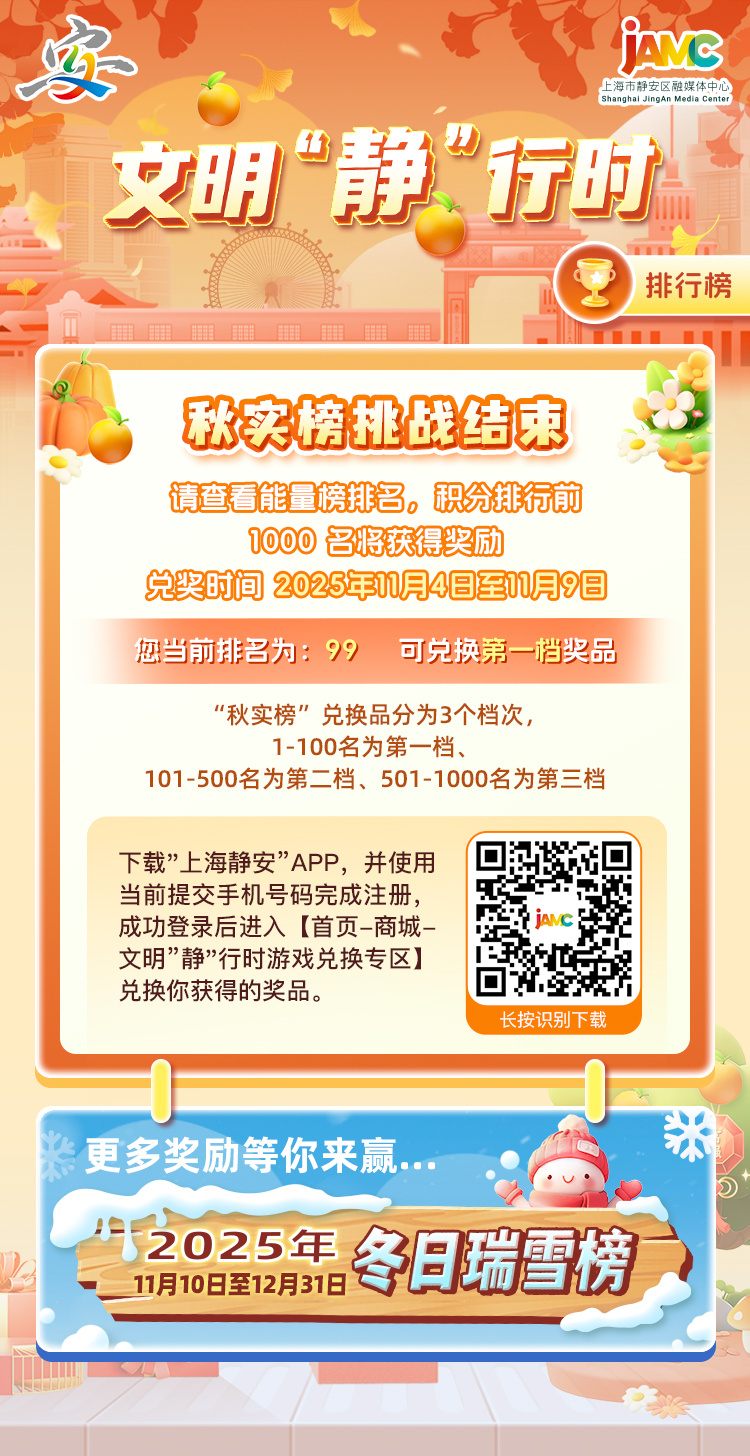 打开“上海静安”客户端→进入“文明‘静’行时”游戏首页即可显示排名及对应奖品