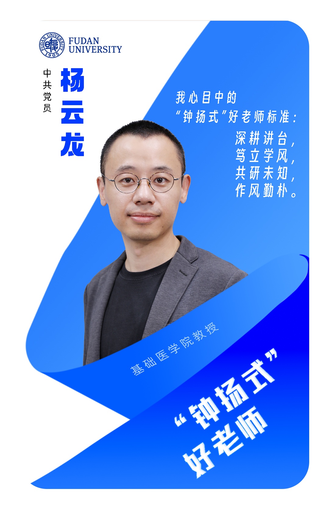 2025年,基础医学院教授杨云龙获评复旦大学“钟扬式”好老师称号。