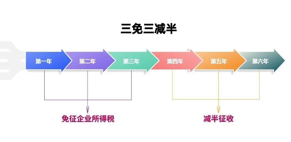 企业从事符合条件的环境保护、节能节水项目的所得,自项目取得第一笔生产经营收入所属纳税年度起,第一年至第三年免征企业所得税,第四年至第六年减半征收企业所得税(简称“三免三减半”)。