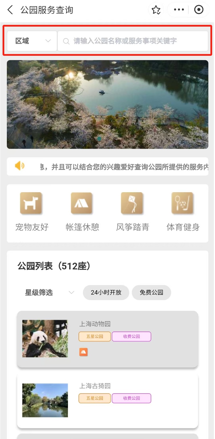 支持一键筛选具有【宠物友好】【帐篷休憩】【风筝踏青】【体育健身】等功能的公园信息,还可以按区域查询公园信息,就近打卡更方便。