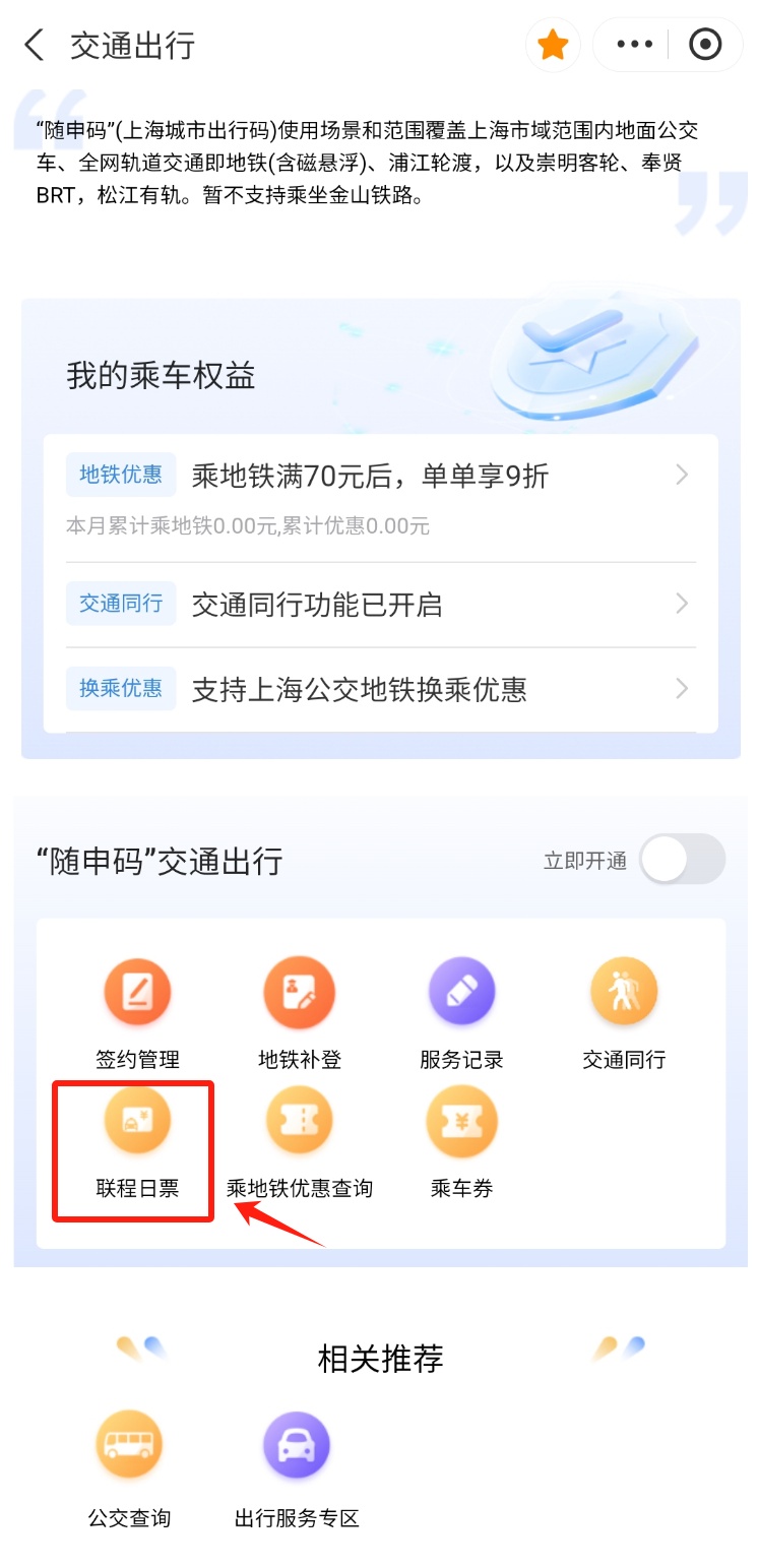 通过“随申办市民云”(APP/微信小程序/支付宝小程序)签约开启“随申码”交通场景应用,轻松享受地铁公交轮渡“一码畅行”,还有乘车优惠+乘客同行等更多权益!
