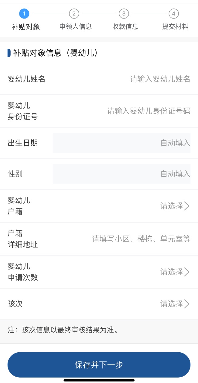 第二步:点击“立即申领”按钮,跳转进入申领页面,按照文字提示填写补贴对象相应信息,点击“保存并下一步”按钮。