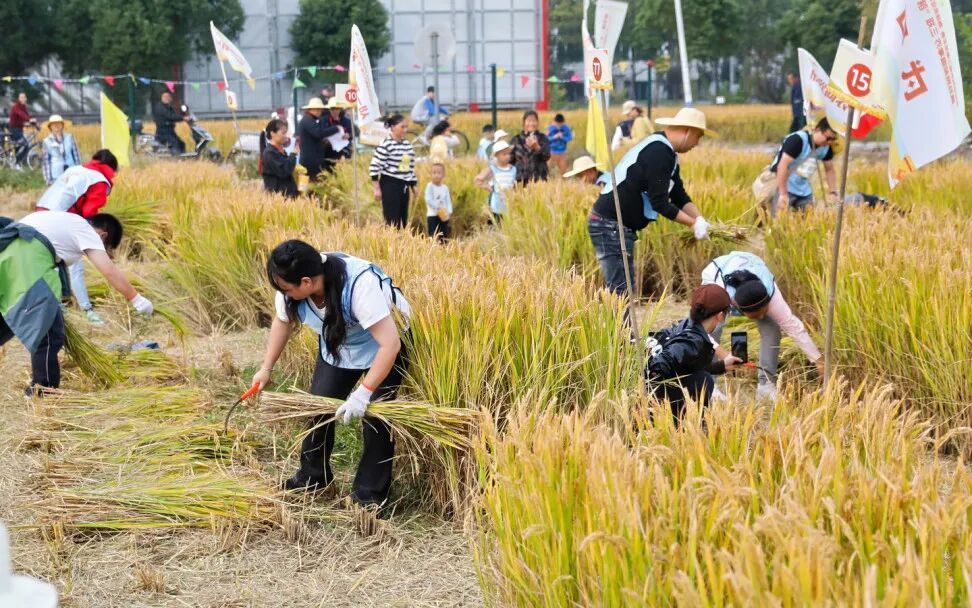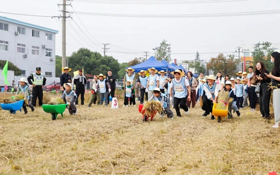 在“稻梦空间”与“稻谷速递”农事趣味竞赛区,气氛紧张而热烈。随着发令声响,家长们手持镰刀躬身下田,熟练地收割、扎捆,孩子们则化身“运输小能手”,推起小车在田埂上往返穿梭,将沉甸甸的稻谷运往终点。田埂上,“爸爸加油!”“小心别撒了!”的呐喊声与欢笑声交织一片。
