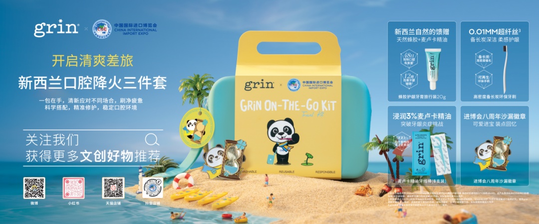 值得一提的是,grin此次将特别推出与进博会联名的限量版口腔护理洗漱包。该套装汇聚品牌王牌产品:蜂胶护龈牙膏、麦卢卡精油牙线棒、备长炭柔护牙刷,并特别附赠进博会8周年纪念“进宝”徽章一枚,是差旅出行的纯净护理佳选。