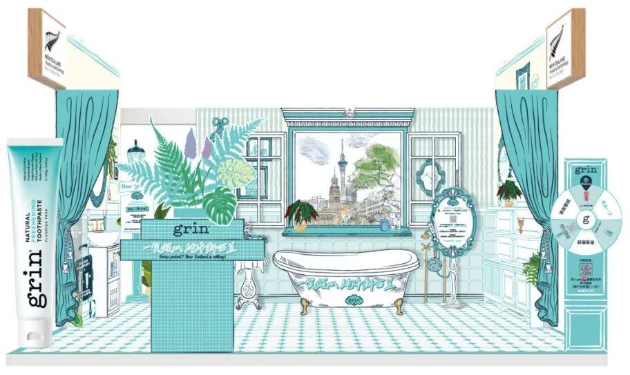 本次展会,grin位于8.1号馆农食展区B4-03 F10展位,与新西兰国家馆联袂登场。展台以“一笑倾心,纯净新西兰”为主题,创新打造了一个沉浸式的“新西兰漫游洗漱空间”。