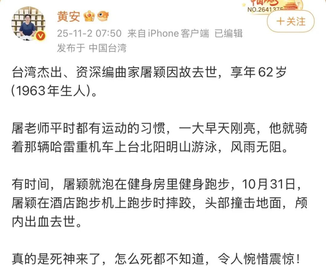 11月2日,歌手黄安发文透露屠颖去世原因:“10月31日,屠颖在酒店跑步机上跑步时摔跤,头部撞击地面,颅内出血去世。”