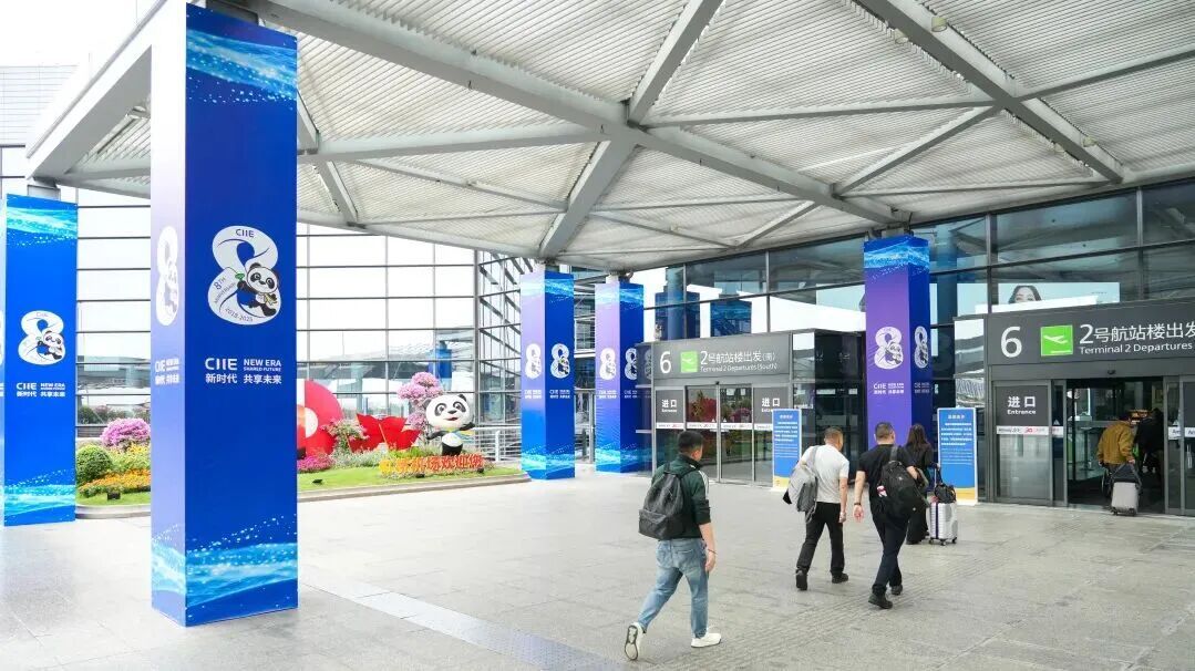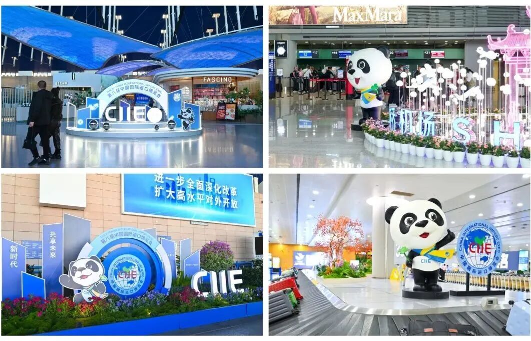 上海机场在两场航站楼出发、到达、场区、停车库以及贵宾室设置了19处进博会主题景观,全面更新花卉景观植物,1千余块电子屏、广告屏上滚动播放进博会宣传海报,进出机场道路的数百面进博会道旗,以及遍布航站楼各处的“进宝”吉祥物不断提升进博会品牌影响力。