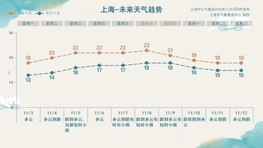 上海中心气象台预报员张晶告诉记者:“这波冷空气的影响较弱,明天开始最高温度又会回升到20℃以上。周三白天会有一次很短的小雨天气过程。周四是一个多云天气,秋高气爽。周五云系又开始增多,一直至周日都是小雨连绵。”