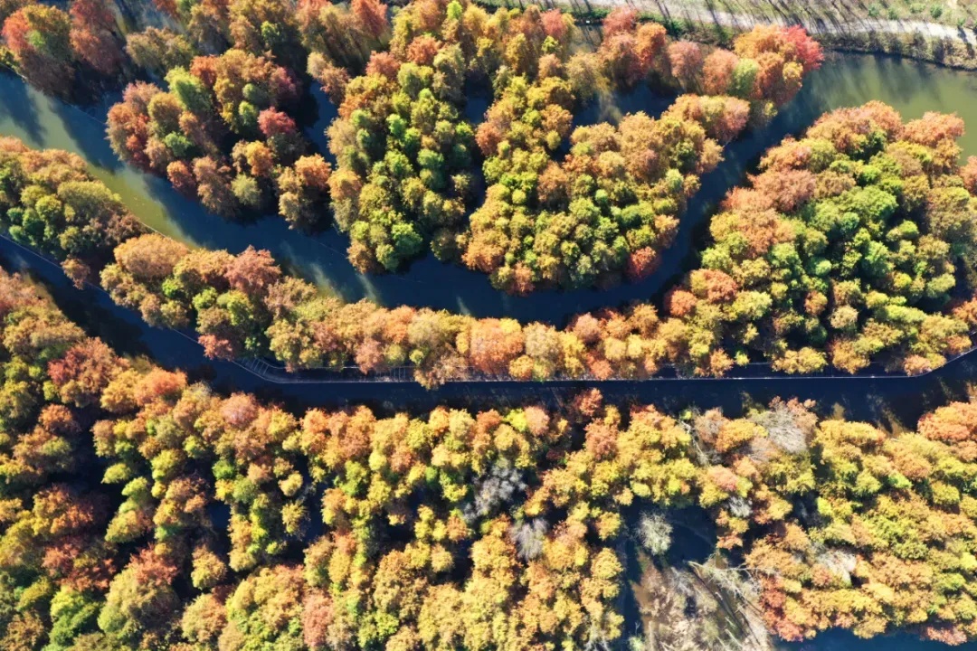 沿着红枫大道前行,便是西沙湿地的入口。随着气温的下降,湿地水森林即将渐染红意,红、黄、绿交织,倒映在清澈的水面上,风吹叶动,层层波光中是西沙湿地最动人的秋日乐章。